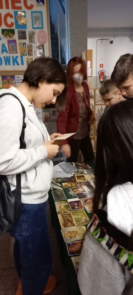 Z ogromną przyjemnością opowiedziałam o historii karty korespondencyjnej. Zaprezentowałam całkiem spory zbiór pocztówek (ok. 557 egz.) z różnych zakątków świata z: Japonii, Belgii, Grecji, Francji, Saksonii, Białorusi … Okazało się, że uczniowie ze sporym zaskoczeniem przyjęli wiadomość o tym, że tuż obok nich znajdują się zabytki ukazane na kartach pocztowych, np.: Pałac w Czerwonym Kościele, Muzeum w Duninie, Kuźnia w Winnicy. Karty ukazujące Legnicę - widok ulic sprzed wielu lat.