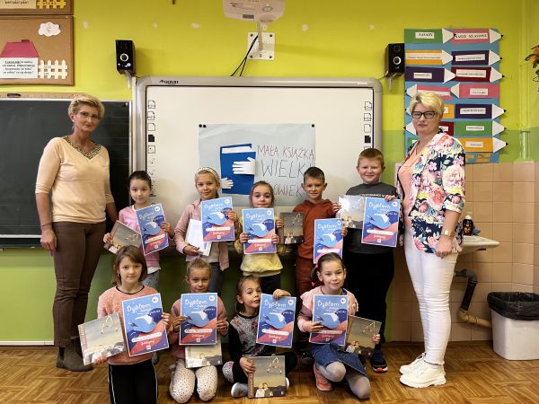 W ramach projektu „Mała książka – wielki człowiek”, który został przygotowany z myślą o dzieciach rozpoczynających edukację w szkole podstawowej i stawiających swoje pierwsze kroki w nauce czytania, pani dyrektor Wioletta Buczkowska przekazała naszym pierwszoklasistom Wyprawki Czytelnicze. Za sprawą tej książki chcemy zaprosić pierwszoklasistów do odbycia niezwykłej przygody, jaką jest umiejętność rozpoznawania liter, składania ich w wyrazy i zdania a w końcu przyjemność czerpana z lektury.