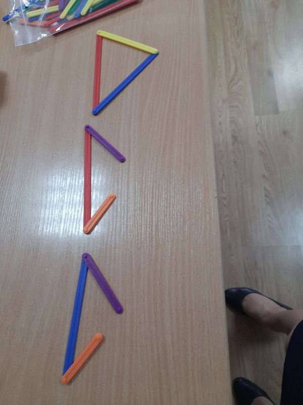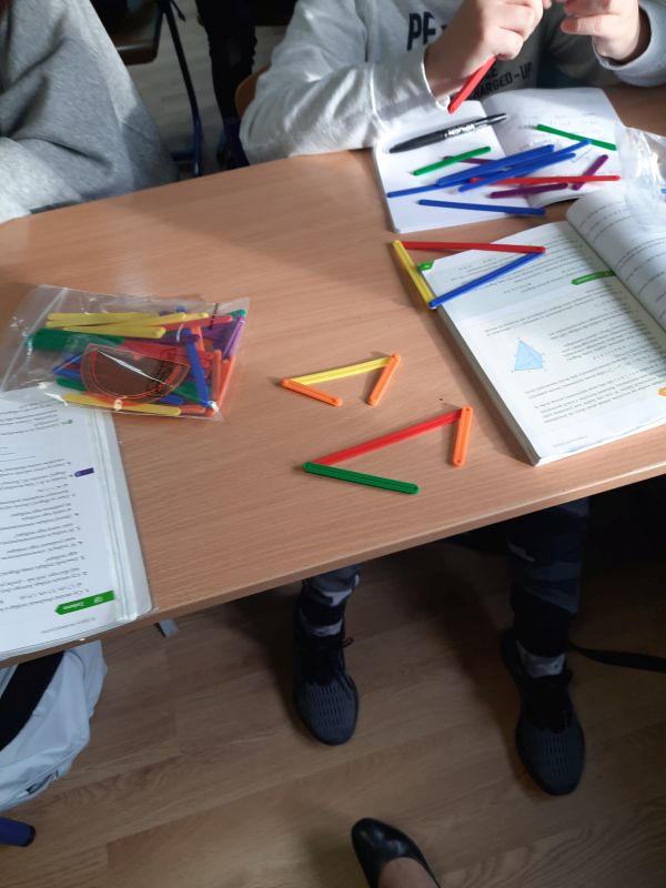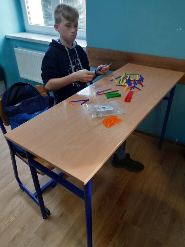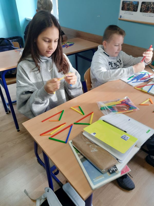Uczniowie sprawdzali, czy z danych boków można zbudować trójkąt, a także uczyli się formułować wnioski używając matematycznego języka i zapisu. Swoje teorie i formalne zapisy mogli sprawdzić empirycznie. Z różnych odcinków starali się zbudować trójkąty. Wykorzystywali do tego celu zestaw kolorowych patyczków, zakupiony w ramach projektu "Laboratoria przyszłości".