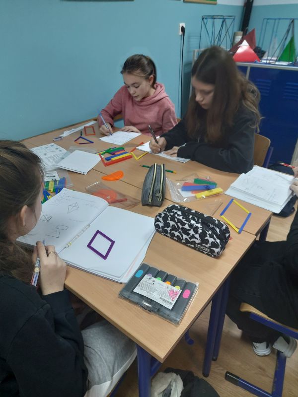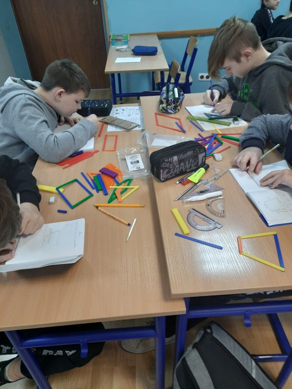 Uczniowie klasy 6 kolejny dzień zmagają się z polami czworokątów. OJ - nie jest łatwo, tyle tych kształtów i wzorów.