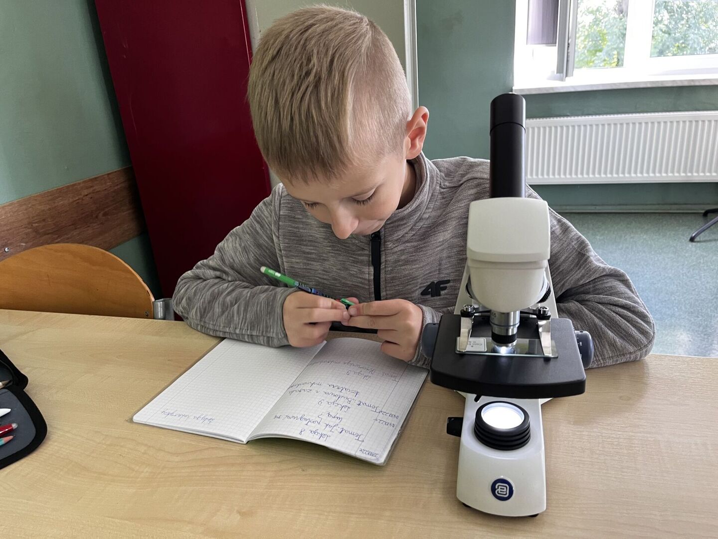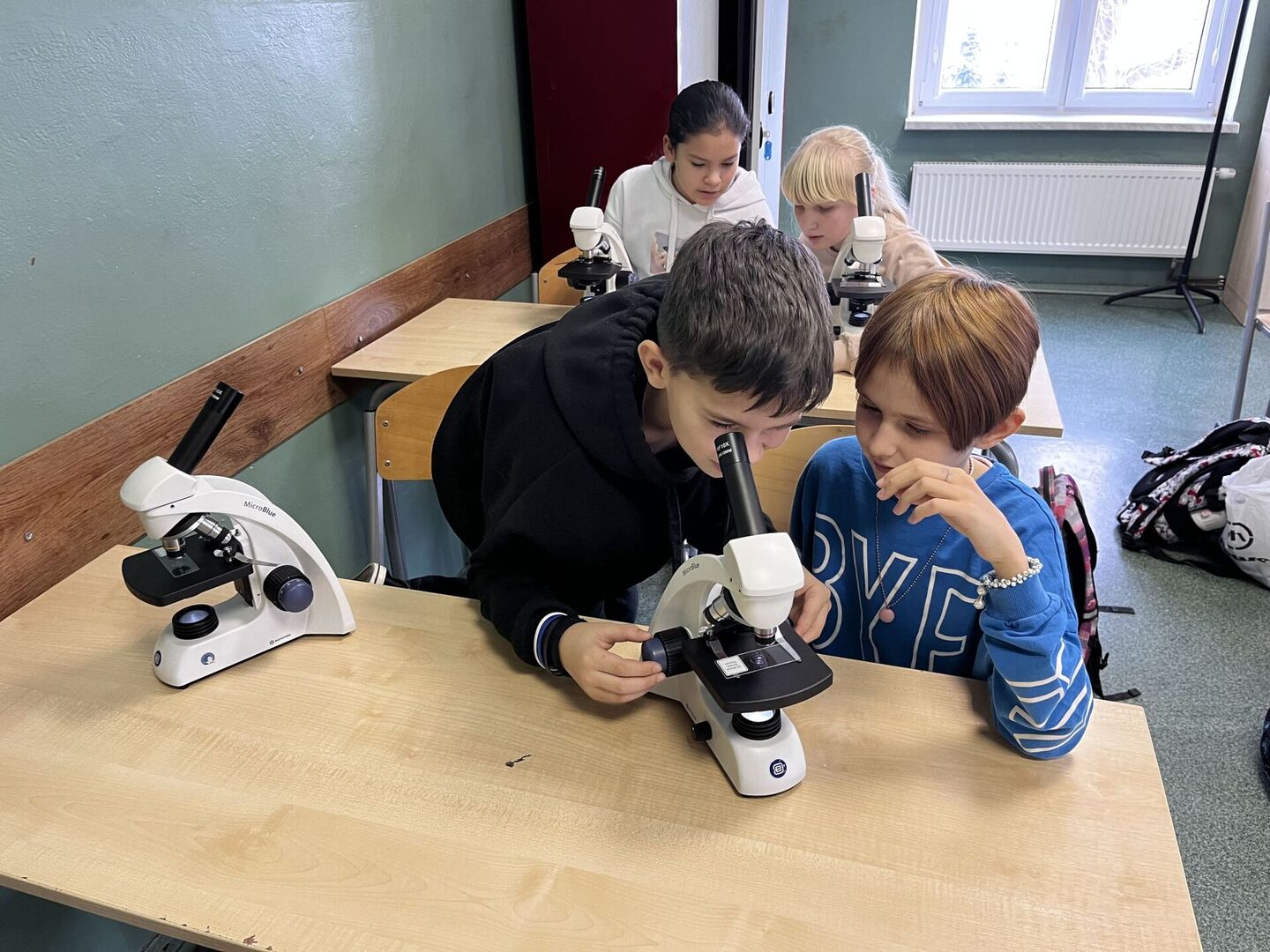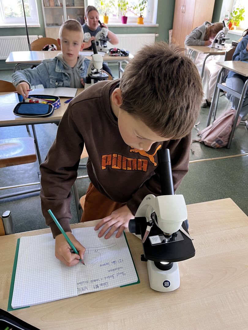 Uczniowie klasy 4 i 5 w ostatnim tygodniu lutego prowadzili obserwacje mikroskopowe z użyciem mikroskopów zkupionych w ramach programu "Laboratoria przyszłości". Uczniowie uczyli się jak ustawiać ostrość obrazu i jak dobrać właściwy obiektyw. Dzieci widziały w powiększeniu między innymi: mięsień sercowy, aparat gębowy pszczoły , łodygę kukurydzy. Po obserwacji wykonywały w zeszytach rysunek obserwowanego obrazu. Wszyscy uczniowie akytywnie uczestniczyli w lekcji, z ogromnym zainteresowaniem i zciekawieniem patrzyli w okular mikroskopu. Wszyscy uczniowie byli zafascynowani tym, co zobaczyli dzięki mikroskopom.