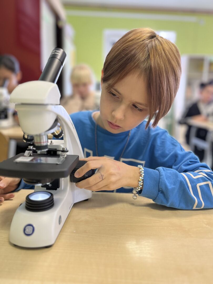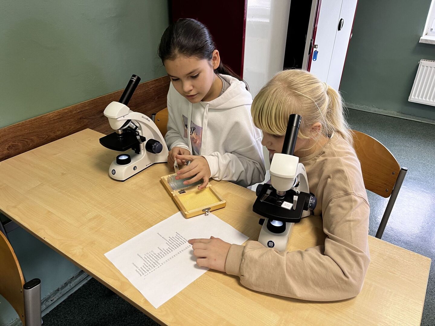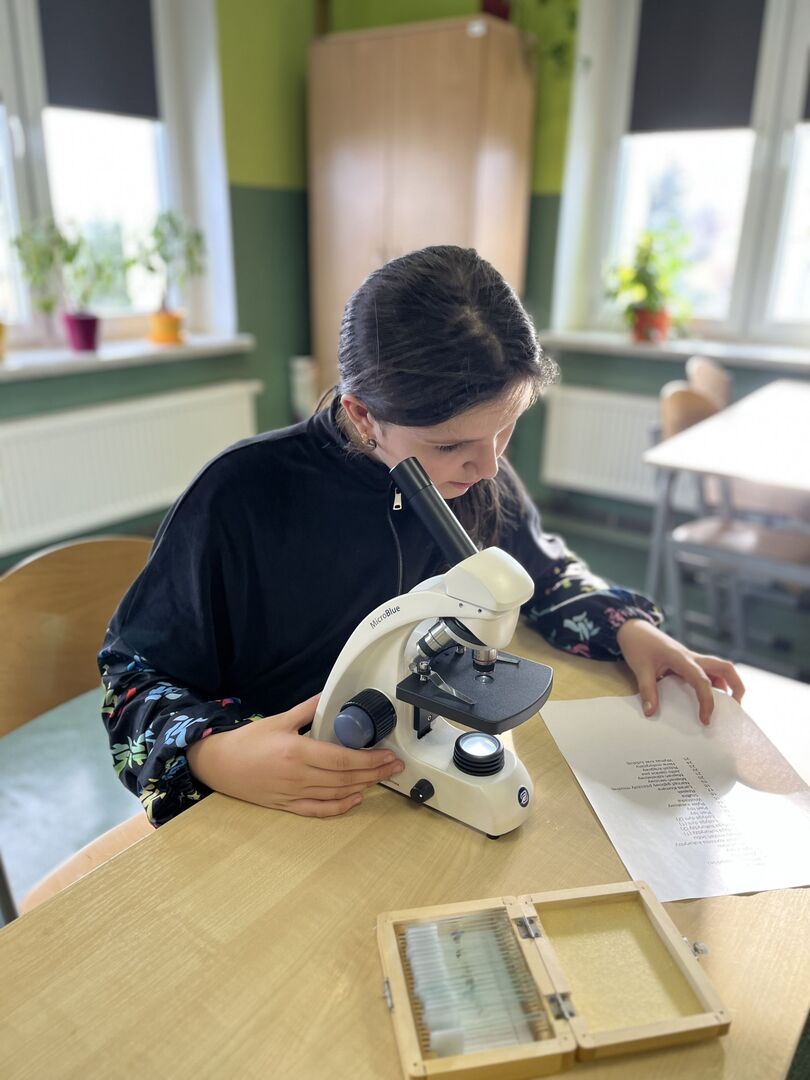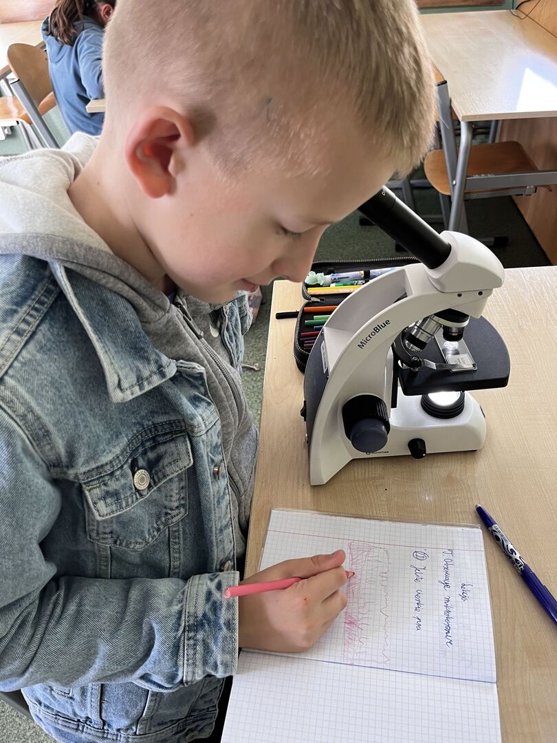 Uczniowie klasy 4 i 5 w ostatnim tygodniu lutego prowadzili obserwacje mikroskopowe z użyciem mikroskopów zkupionych w ramach programu "Laboratoria przyszłości". Uczniowie uczyli się jak ustawiać ostrość obrazu i jak dobrać właściwy obiektyw. Dzieci widziały w powiększeniu między innymi: mięsień sercowy, aparat gębowy pszczoły , łodygę kukurydzy. Po obserwacji wykonywały w zeszytach rysunek obserwowanego obrazu. Wszyscy uczniowie akytywnie uczestniczyli w lekcji, z ogromnym zainteresowaniem i zciekawieniem patrzyli w okular mikroskopu. Wszyscy uczniowie byli zafascynowani tym, co zobaczyli dzięki mikroskopom.