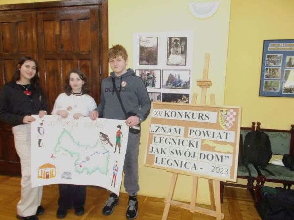 W piątek 31 marca 2023 r. uczniowie naszej szkoły: Marcelina Cieśla, Zuzanna Biskup i Nikodem Jasiński brali udział w XV Powiatowym Konkursie „Znam powiat legnicki jak swój dom” organizowanym przez Polskie Towarzystwo Turystyczno – Krajoznawcze Oddział Legnica, Starostwo Powiatowe w Legnicy i Schronisko Młodzieżowe w Legnicy.