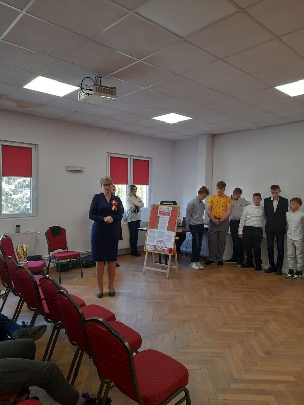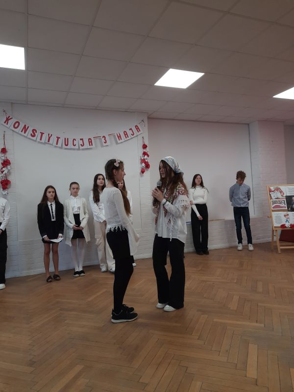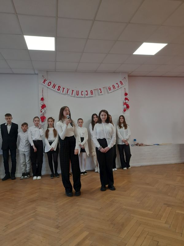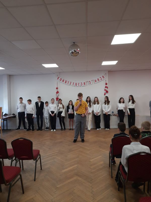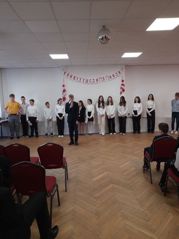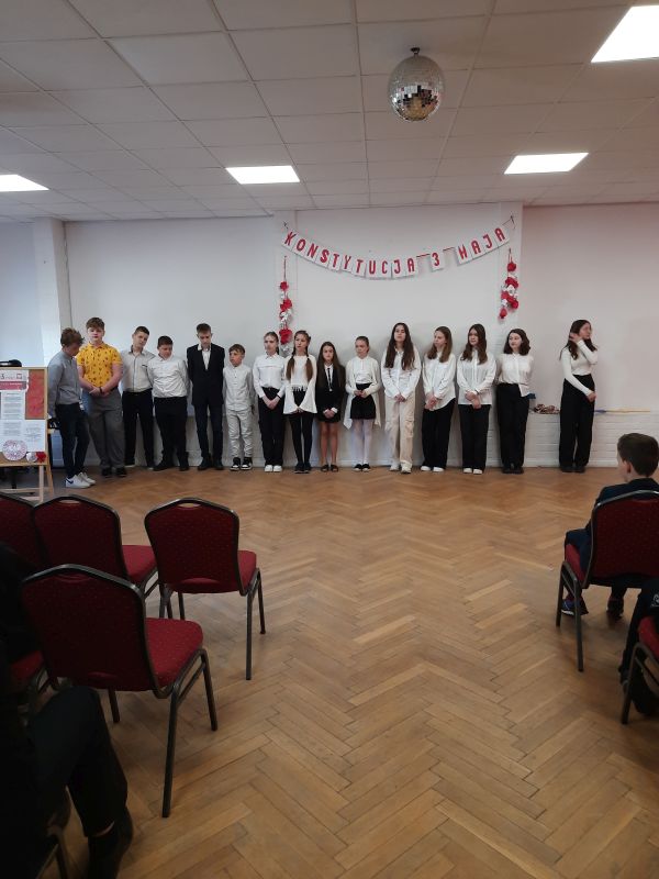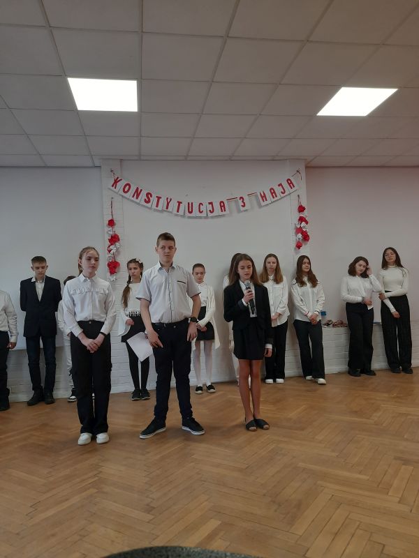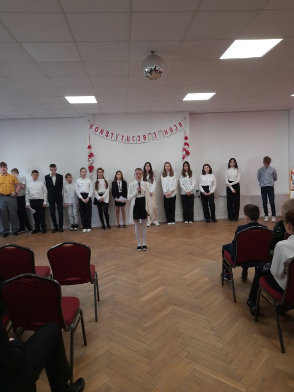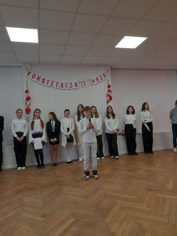 Uczniowie klasy 6 pod opieką p. Dominiki Wicińskiej, p. Joanny Łowkiel i p. Krzysztofa Walickiego zaprosili społeczność szkolną na uroczysty apel z okazji Święta Konstytucji 3 Maja. Nasi uczniowie pięknie recytowali, śpiewali, grali na flacie, a swój występ zakończyli tańcem polonezem.