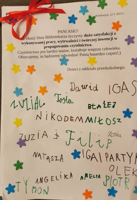 Dziękując wszystkim za udział w obchodach naszego wspólnego święta - DZIĘKUJĘ za udział, życzenia i wszelką pomoc. Zapraszam serdecznie do biblioteki wszystkich, którzy bardzo lubią - jak i tych, którzy nie lubią czytać. Ci drudzy - być może nie trafili jeszcze na tę właściwą książkę...