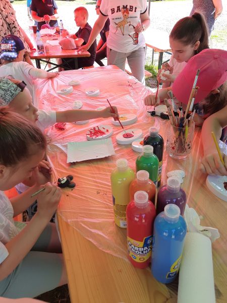 - chętni i zmęczeni uczniowie mogli usiąść w zaciszu parasoli i oddać się malowaniu figur gipsowych lub toreb.