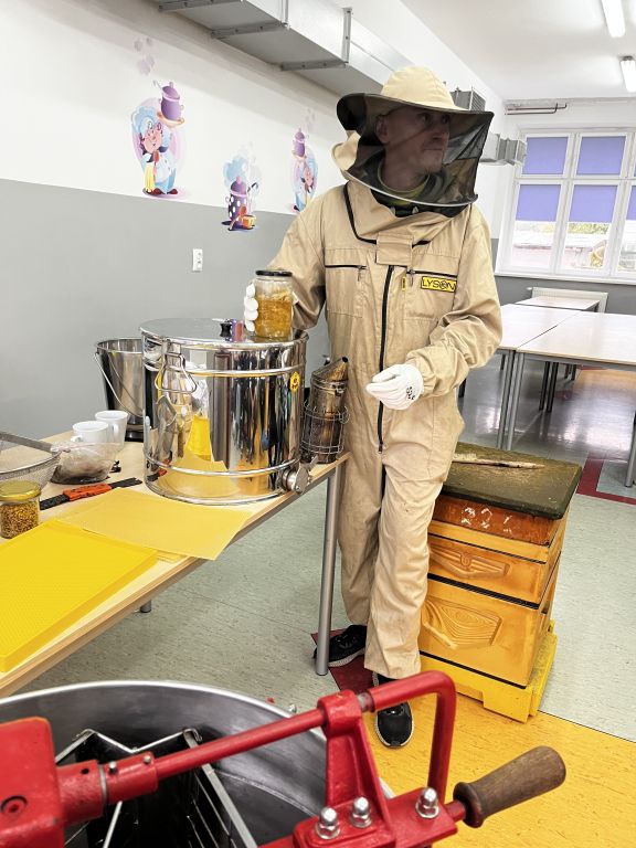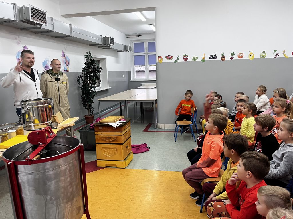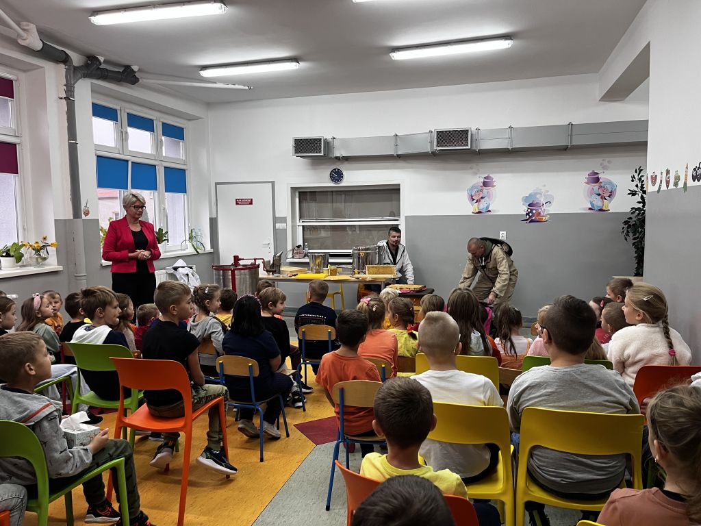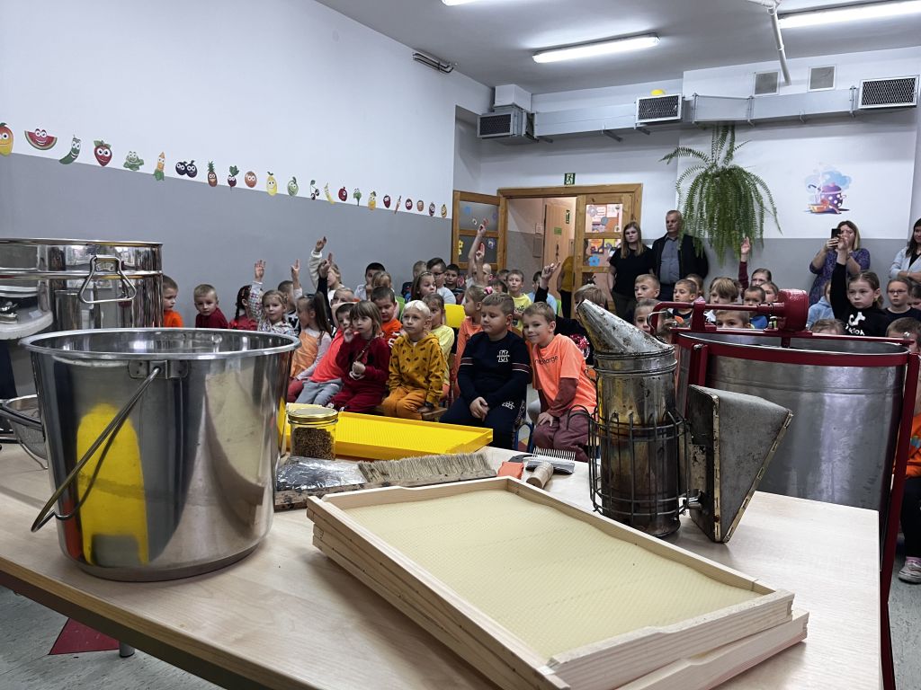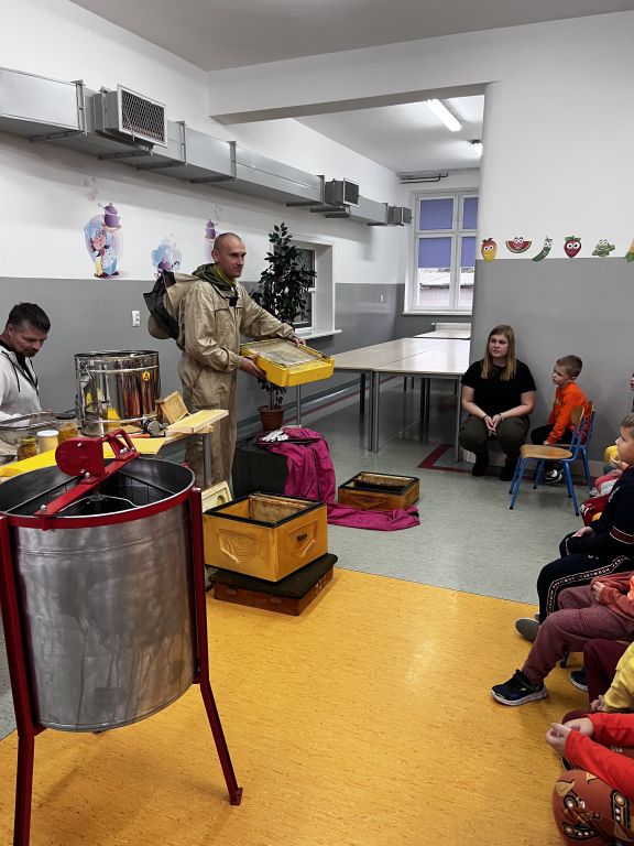 Bardzo dużo emocji wśród dzieci wzbudziły akcesoria potrzebne do pracy pszczelarzowi. Panowie opowiadali jak należy ubierać się do pracy przy ulach, pokazywali jak się zadymia ule, aby obłaskawić pszczoły broniące swojego dobytku. Obserwowali jak w wirówce do miodu pozyskuje się miód z ramek i jak przez specjalny zawór wydostaje się złocisty, słodki nektar.