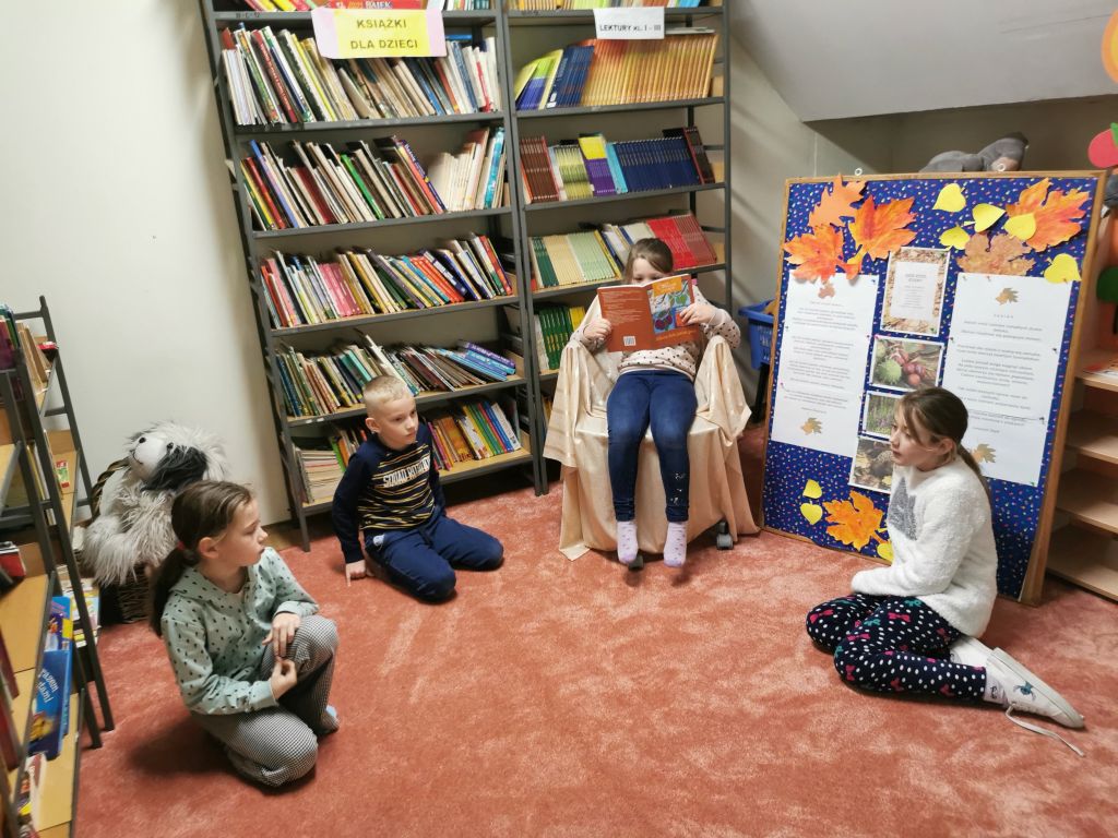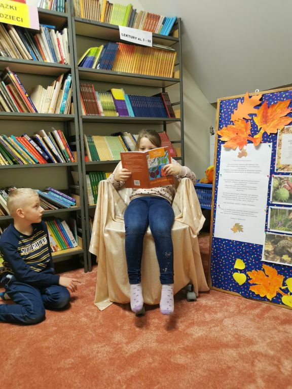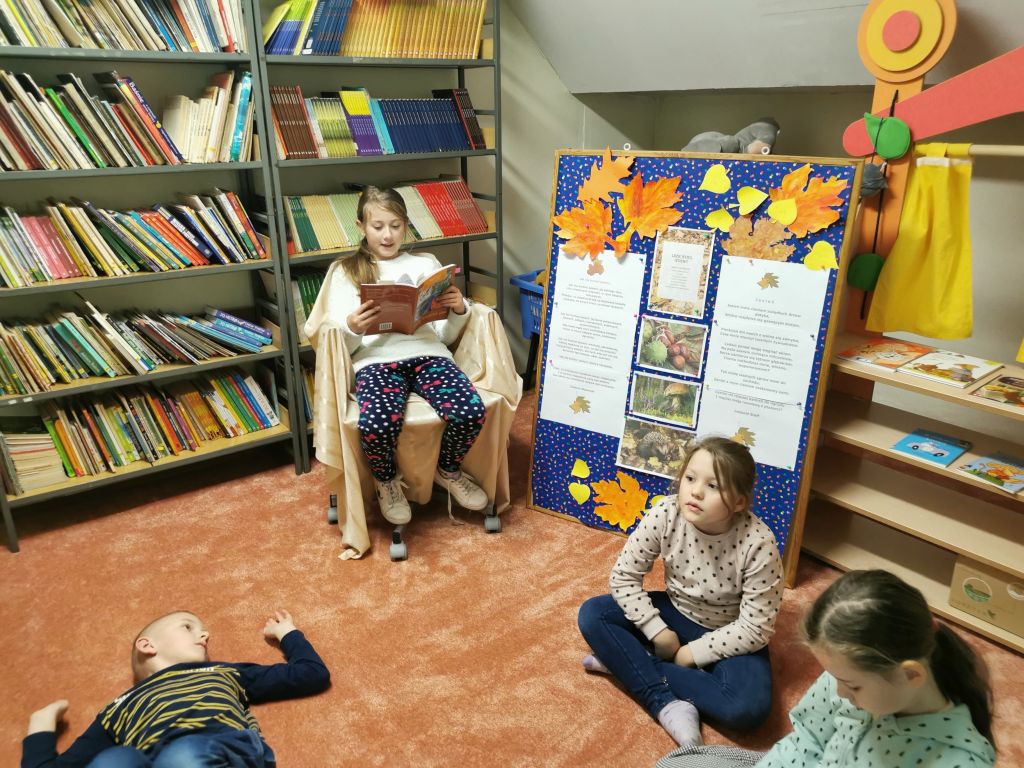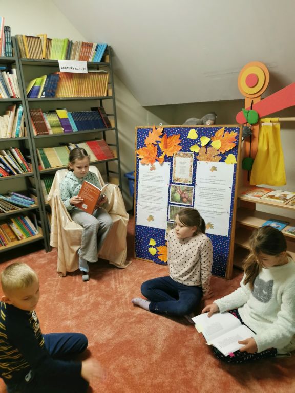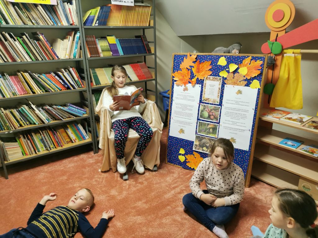 W ramach zadań KLUBU POŻERACZY KSIĄŻEK - Wyzwanie nr 1 podjęła Daria Łakoma z kl. 3. Zorganizowała spotkanie czytelnicze - "Czytanie na Dywanie - wierszy o jesieni". Daria osobiście wybrała teksty o tematyce jesiennej prezentując je w miłej atmosferze wraz z zaproszonymi gośćmi: Zosią i Karolem z kl. 1, Hanią z kl. 2. Każdy czytał we własnym tempie, bez pośpiechu i bez oceniania.