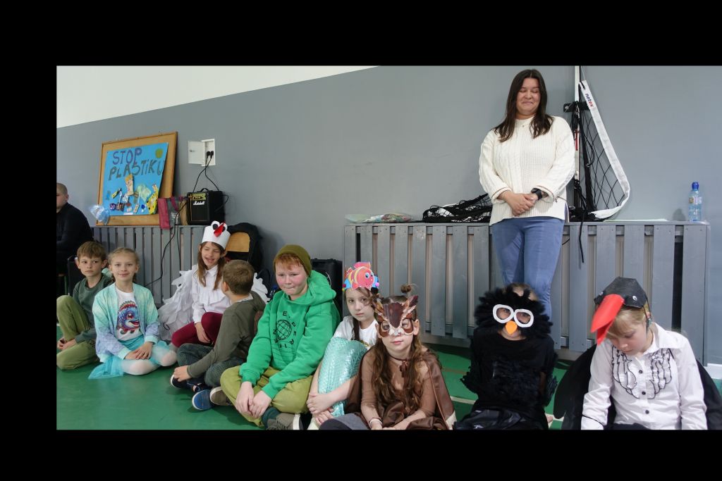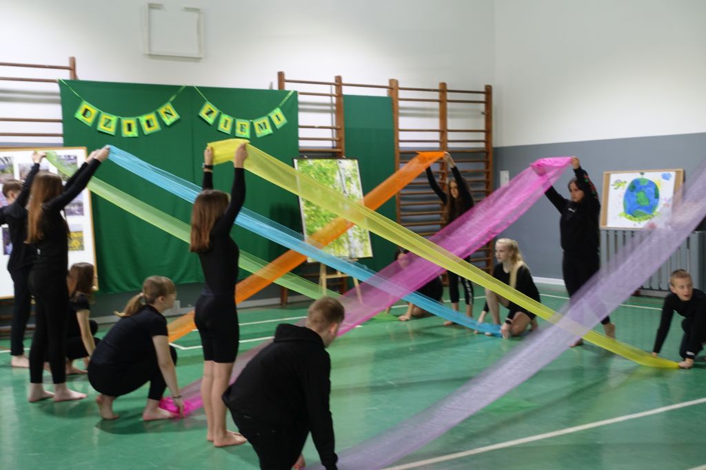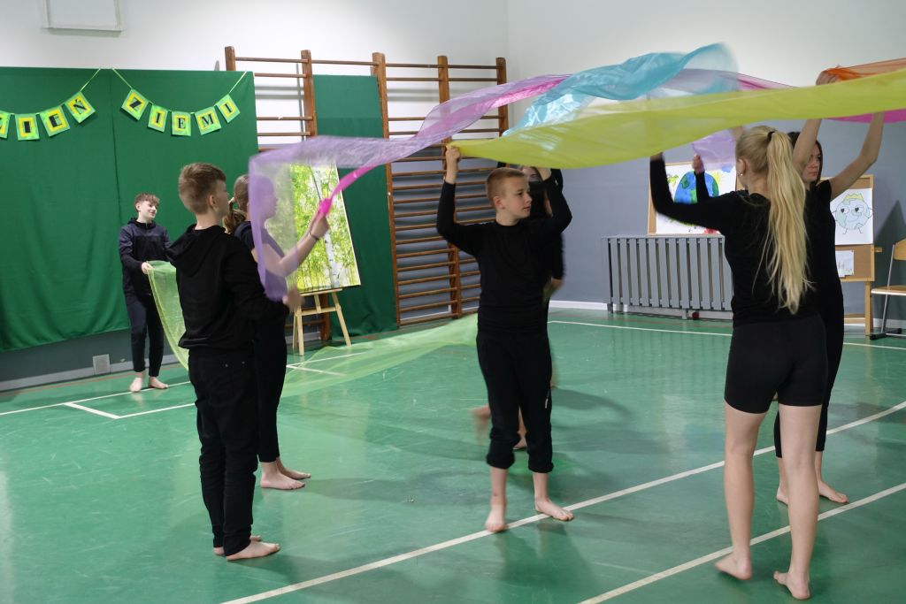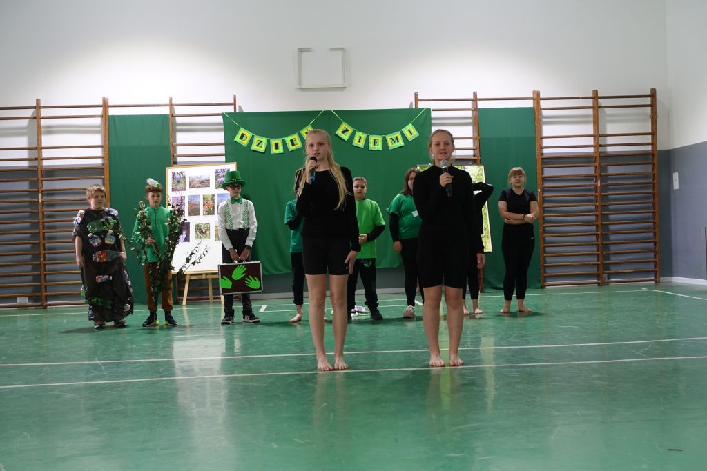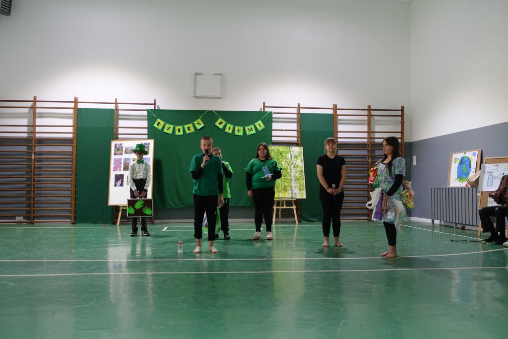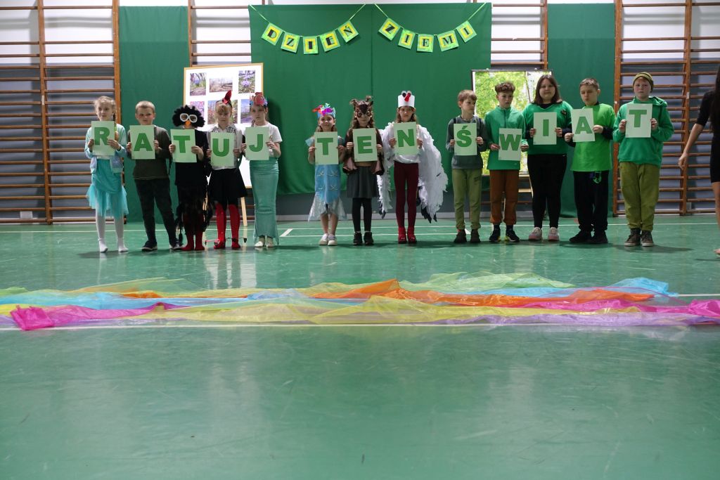 Program artystyczny rozpoczęli uczniowie klasy 5, którzy przedstawili inscenizację na temat dbania o środowisko. W drugiej części obejrzeliśmy układ choreograficzny z kolorowymi szarfami w wykonaniu pozostałych młodych artystów. Na zakończenie na scenie pojawili się uczniowie klasy 2, w przebraniach różnych zwierząt, z ważnym przesłaniem skierowanym do wszystkich zgromadzonych: "Ratujmy ten świat!"