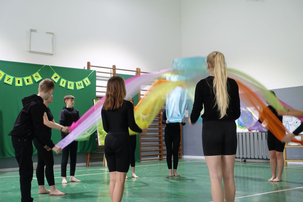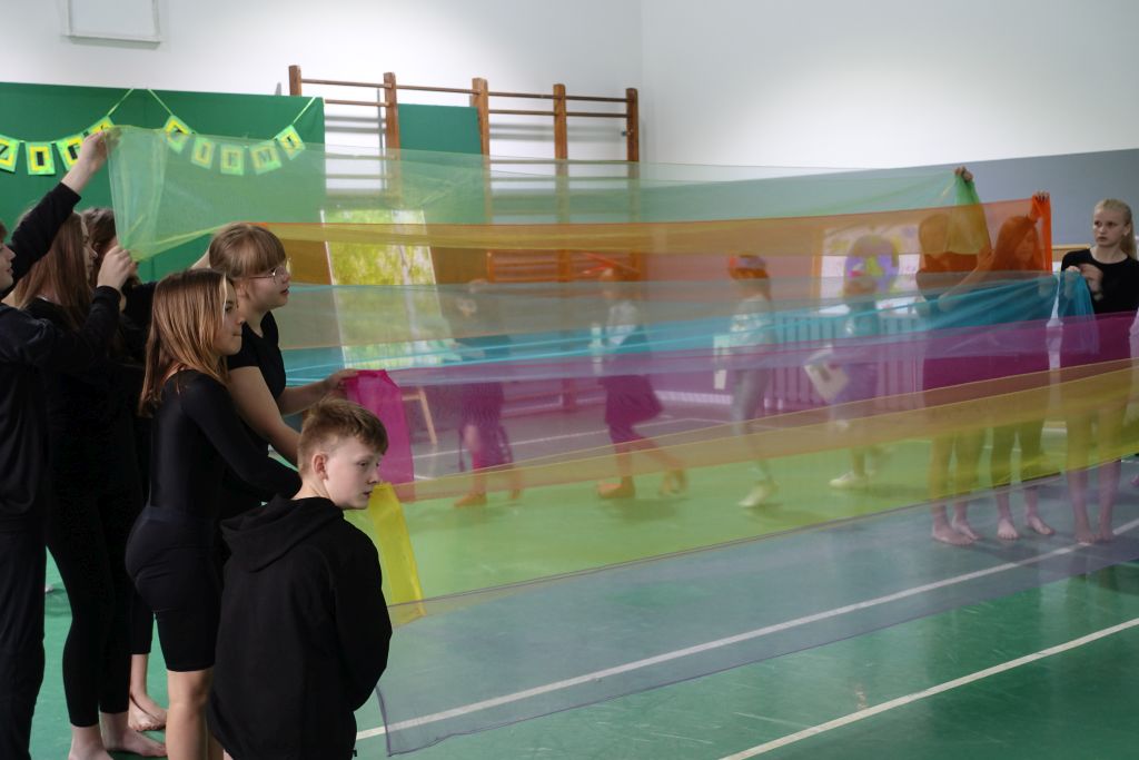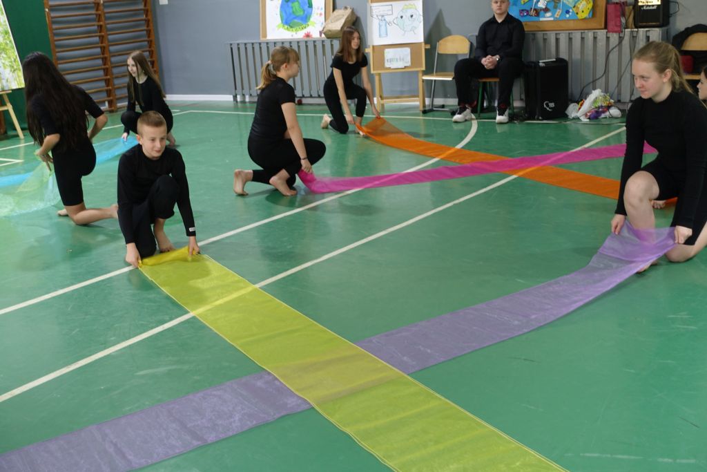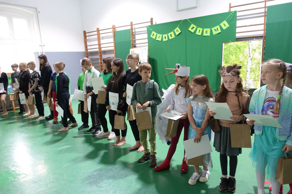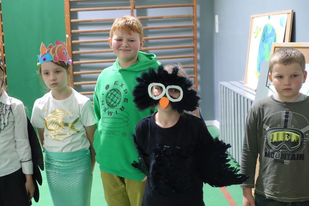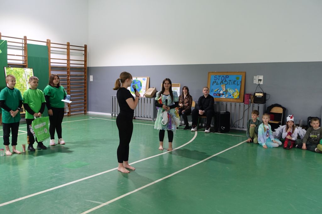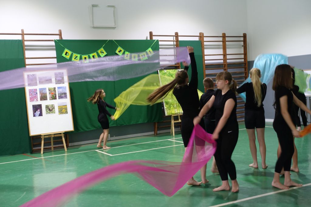 Program artystyczny rozpoczęli uczniowie klasy 5, którzy przedstawili inscenizację na temat dbania o środowisko. W drugiej części obejrzeliśmy układ choreograficzny z kolorowymi szarfami w wykonaniu pozostałych młodych artystów. Na zakończenie na scenie pojawili się uczniowie klasy 2, w przebraniach różnych zwierząt, z ważnym przesłaniem skierowanym do wszystkich zgromadzonych: "Ratujmy ten świat!"