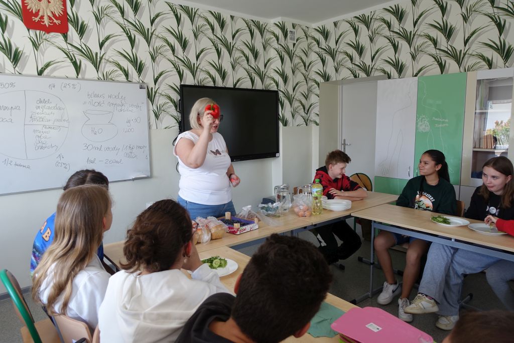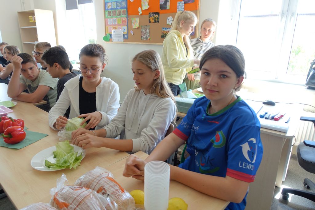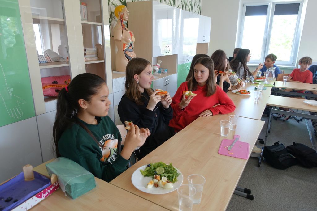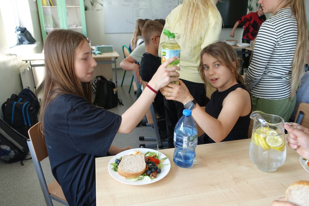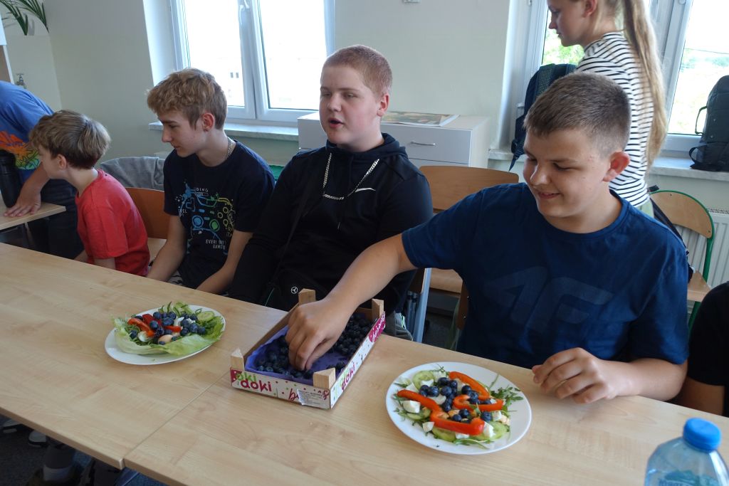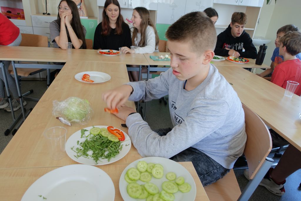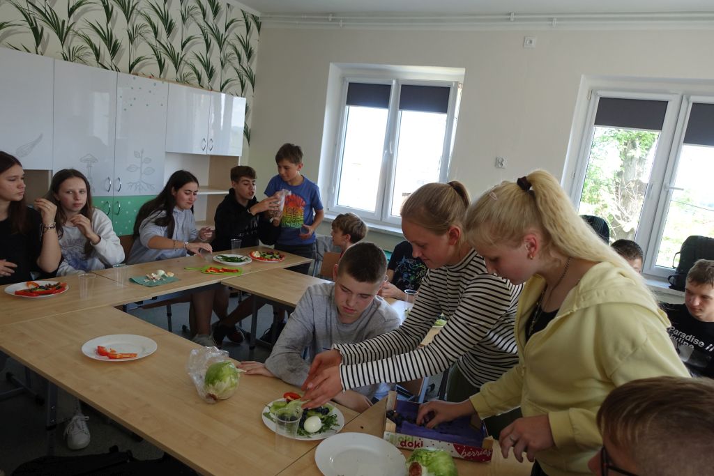 Pod okiem naszego gościa, uczniowie przygotowywali zdrowe i kolorowe posiłki. Na ich talerzach znalazły się takie składniki jak jajka, świeży ogórek, chrupiąca papryka, słodkie borówki, soczysta sałata i pełnoziarnisty chleb. Każdy z uczestników mógł poczuć się jak prawdziwy szef kuchni, komponując własne, zdrowe przekąski.
