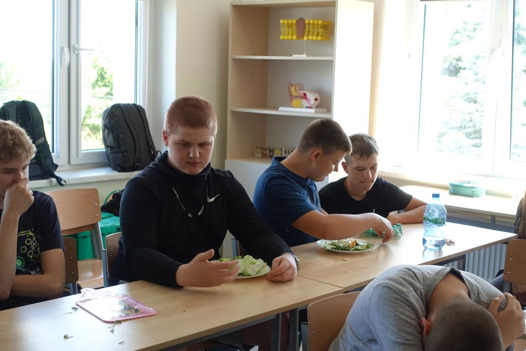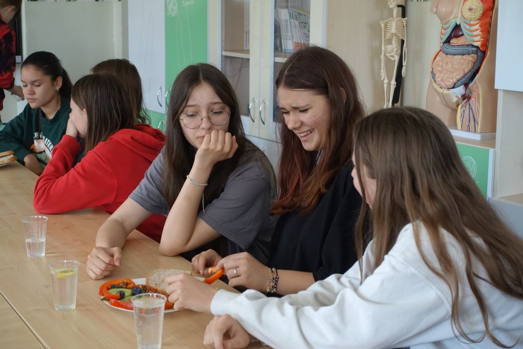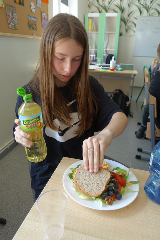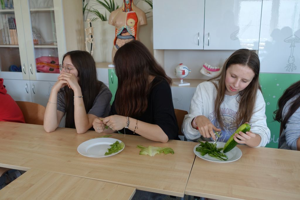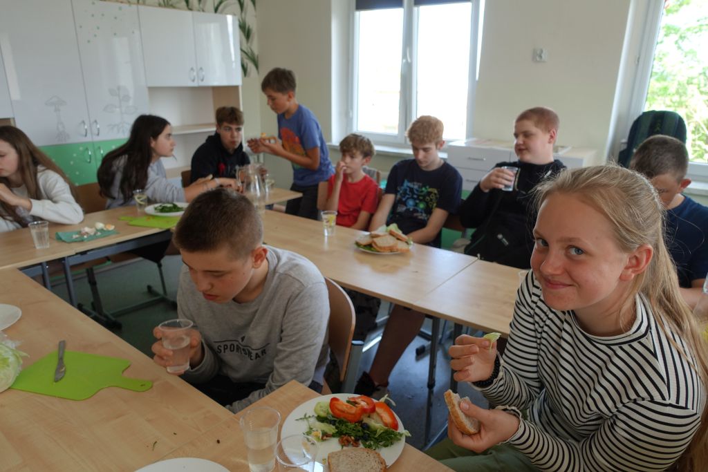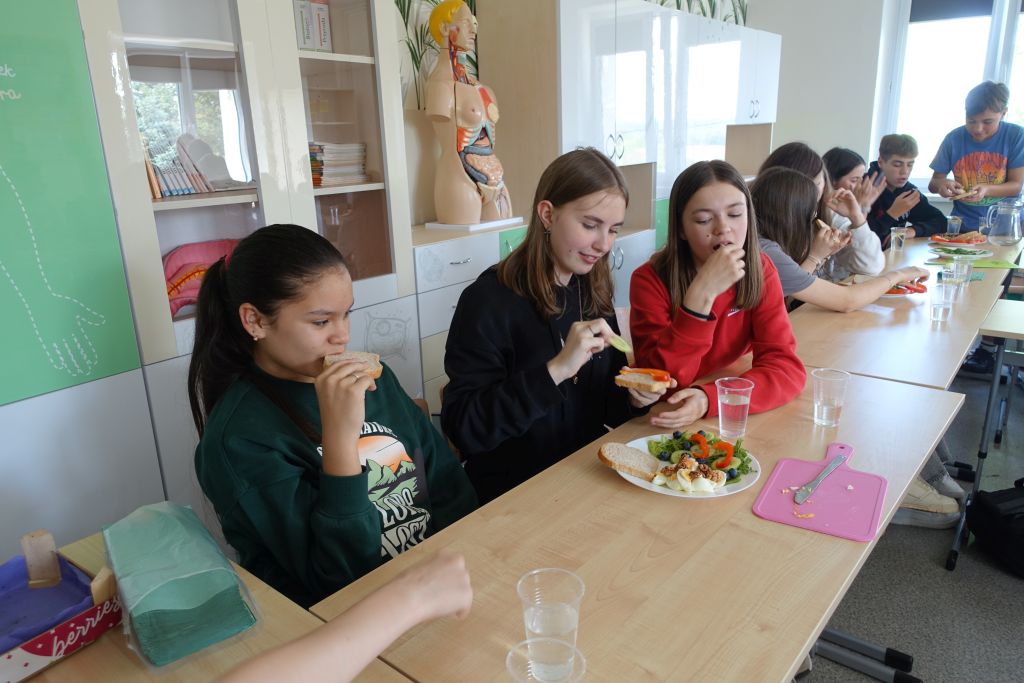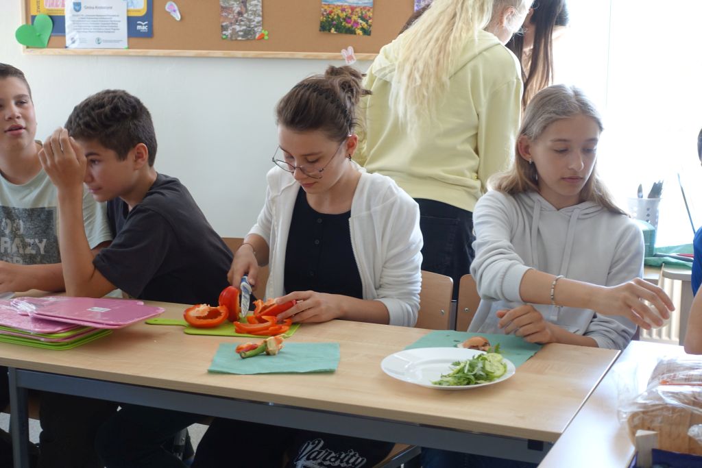 Pod okiem naszego gościa, uczniowie przygotowywali zdrowe i kolorowe posiłki. Na ich talerzach znalazły się takie składniki jak jajka, świeży ogórek, chrupiąca papryka, słodkie borówki, soczysta sałata i pełnoziarnisty chleb. Każdy z uczestników mógł poczuć się jak prawdziwy szef kuchni, komponując własne, zdrowe przekąski.