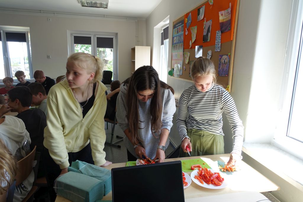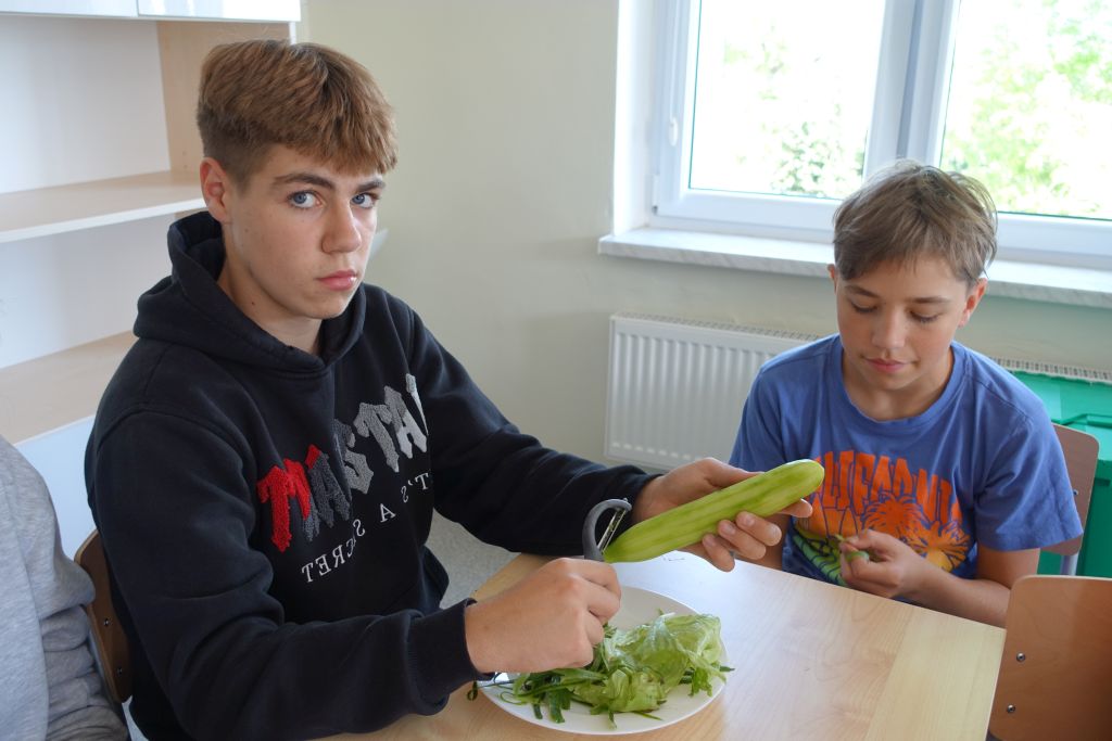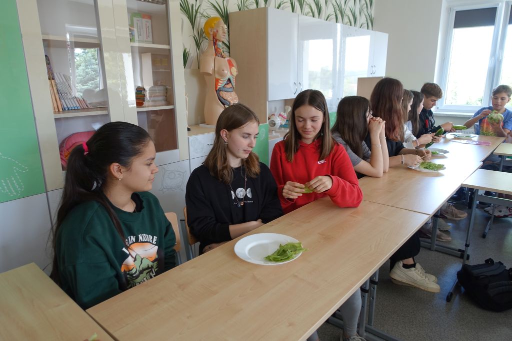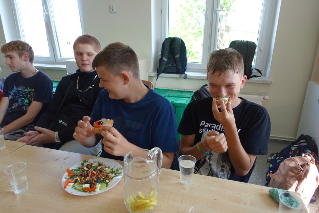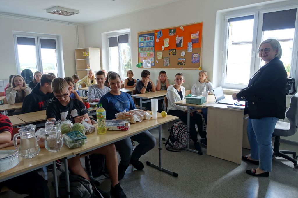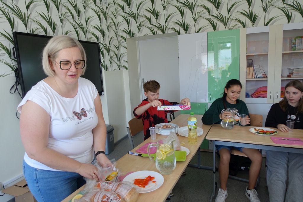 Pod okiem naszego gościa, uczniowie przygotowywali zdrowe i kolorowe posiłki. Na ich talerzach znalazły się takie składniki jak jajka, świeży ogórek, chrupiąca papryka, słodkie borówki, soczysta sałata i pełnoziarnisty chleb. Każdy z uczestników mógł poczuć się jak prawdziwy szef kuchni, komponując własne, zdrowe przekąski.