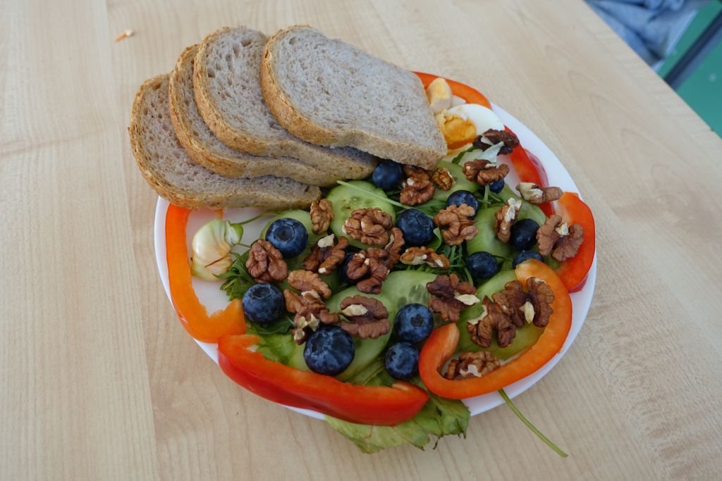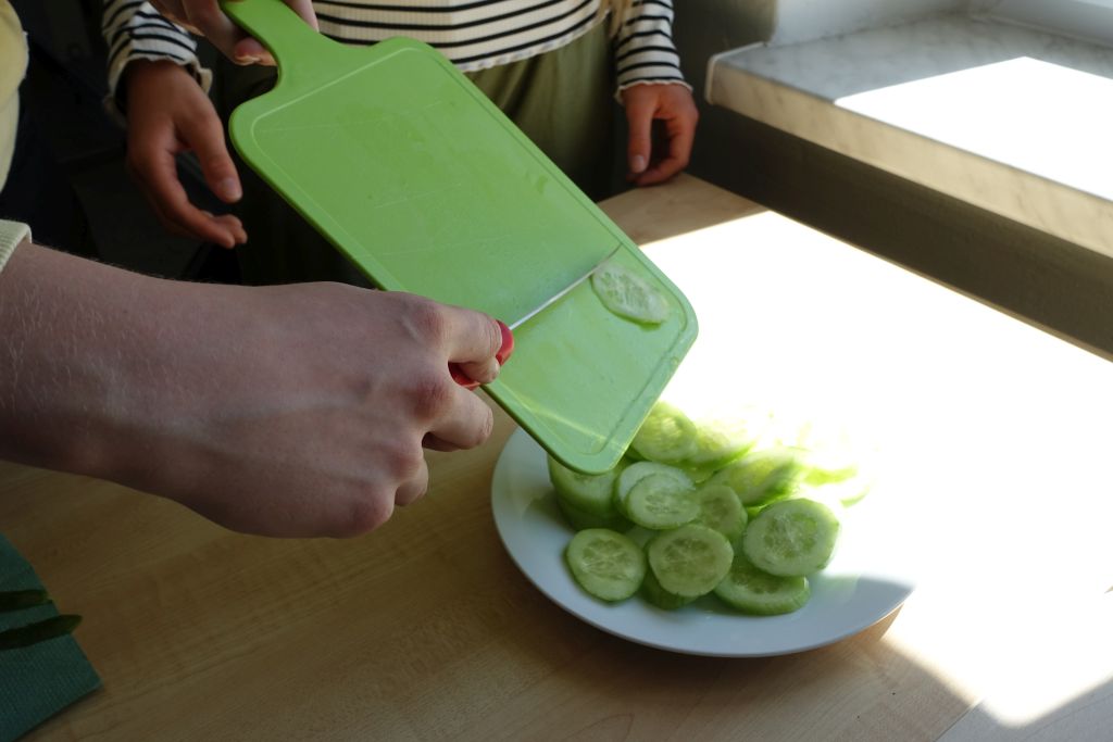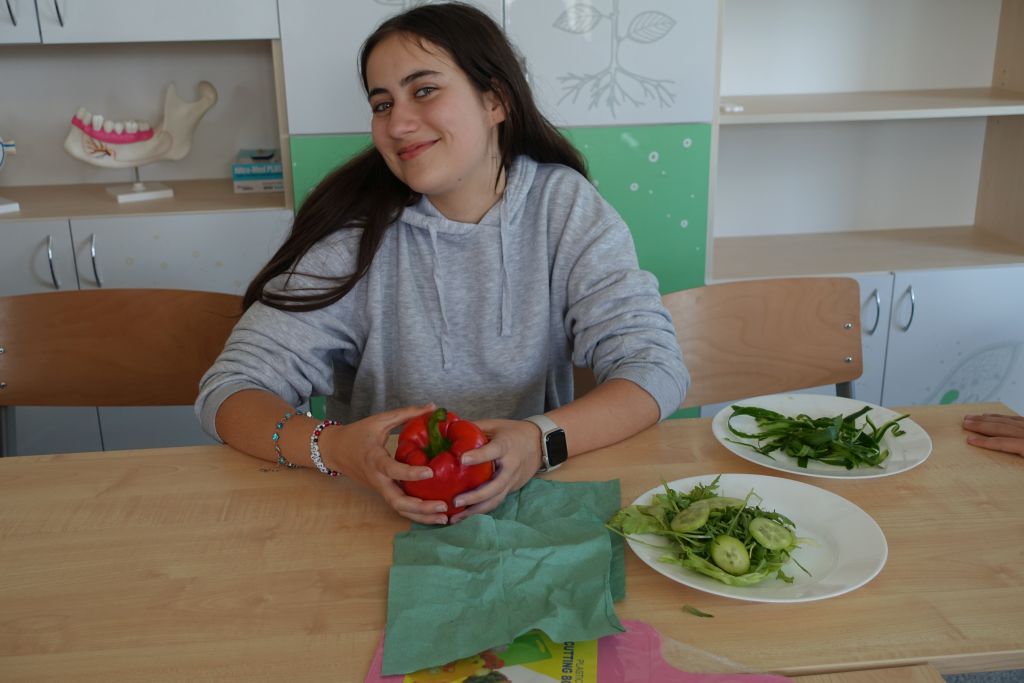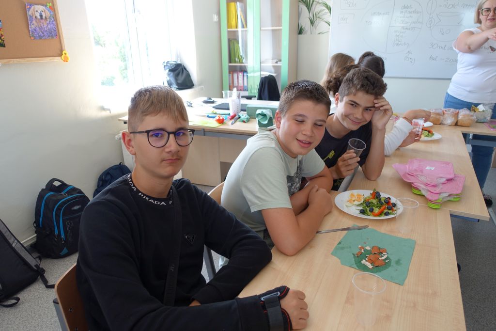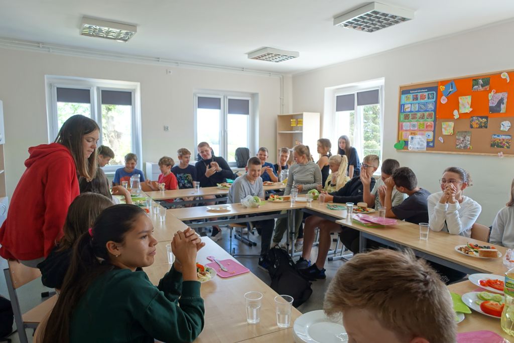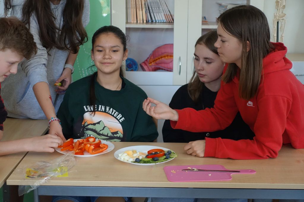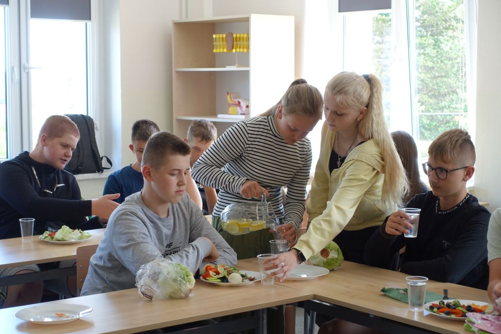 Pod okiem naszego gościa, uczniowie przygotowywali zdrowe i kolorowe posiłki. Na ich talerzach znalazły się takie składniki jak jajka, świeży ogórek, chrupiąca papryka, słodkie borówki, soczysta sałata i pełnoziarnisty chleb. Każdy z uczestników mógł poczuć się jak prawdziwy szef kuchni, komponując własne, zdrowe przekąski.