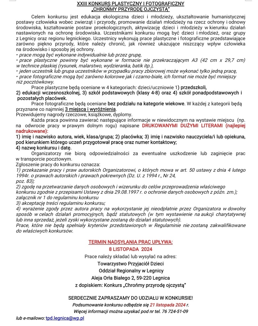 TPD ogłasza konkurs plastyczny i fotograficzny "Chrońmy przyrodę ojczystą". Szczegóły w załączniku.