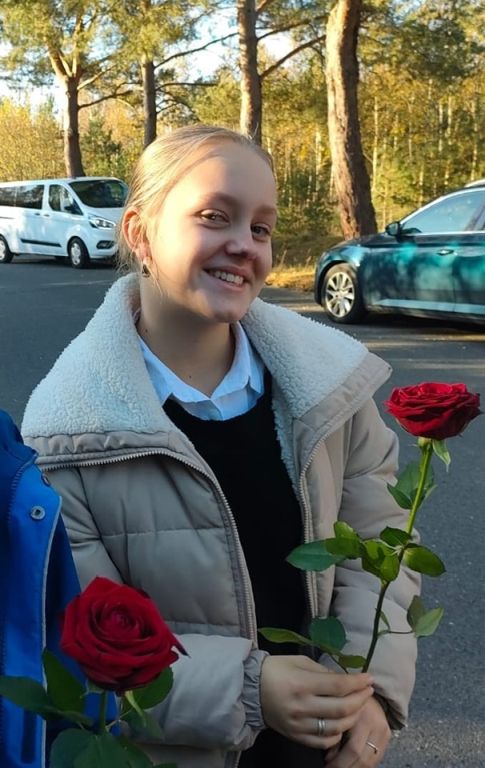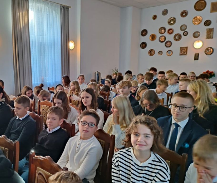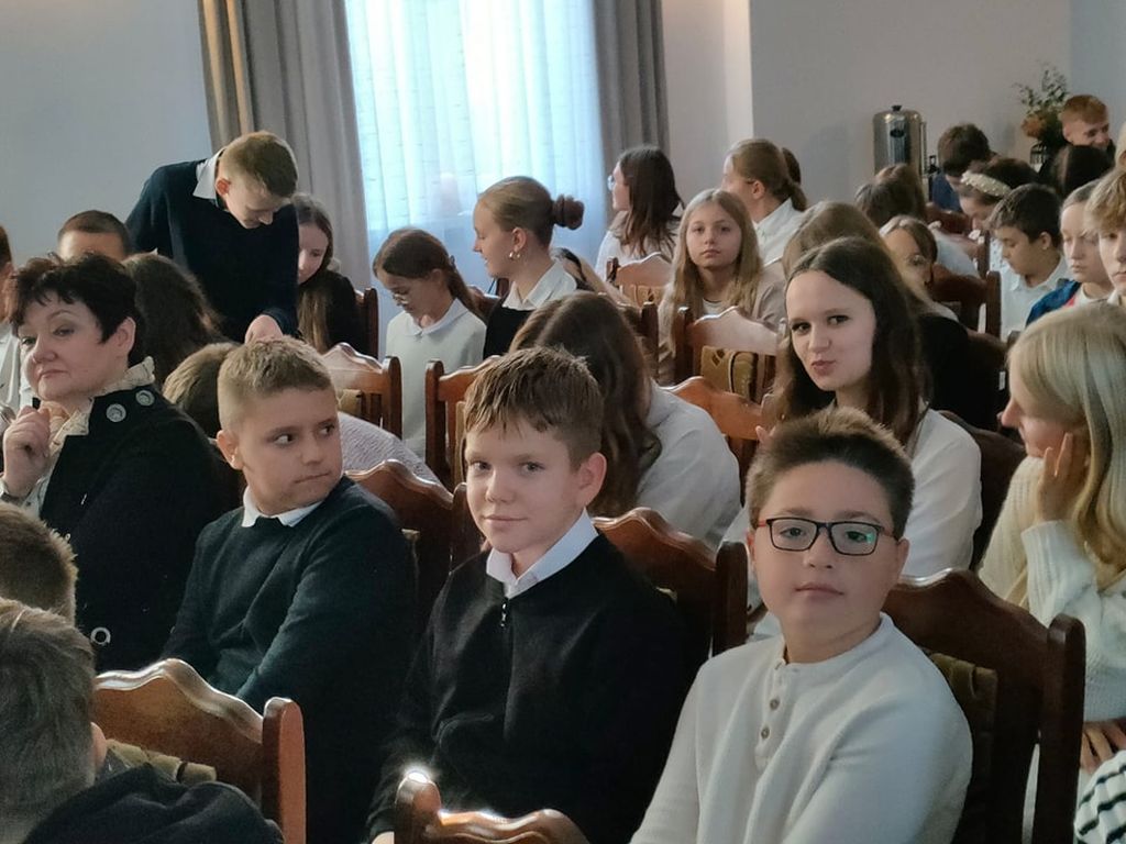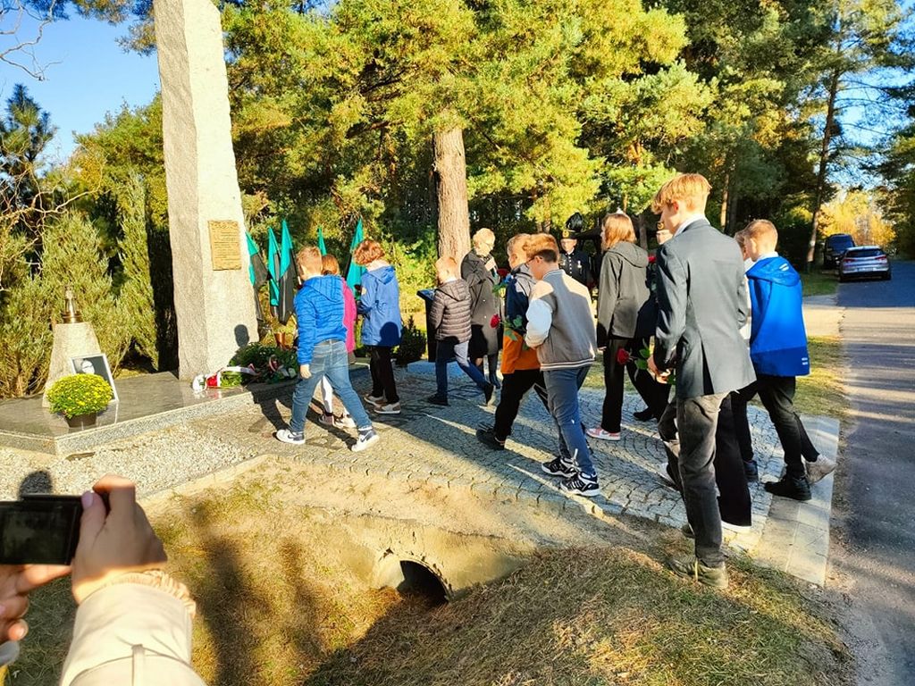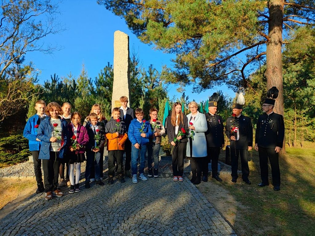 Uczniowie złożyli róże pod obeliskiem w Sieroszowicach, a następnie wzięli udział w konferencji poświęconej naszemu patronowi.