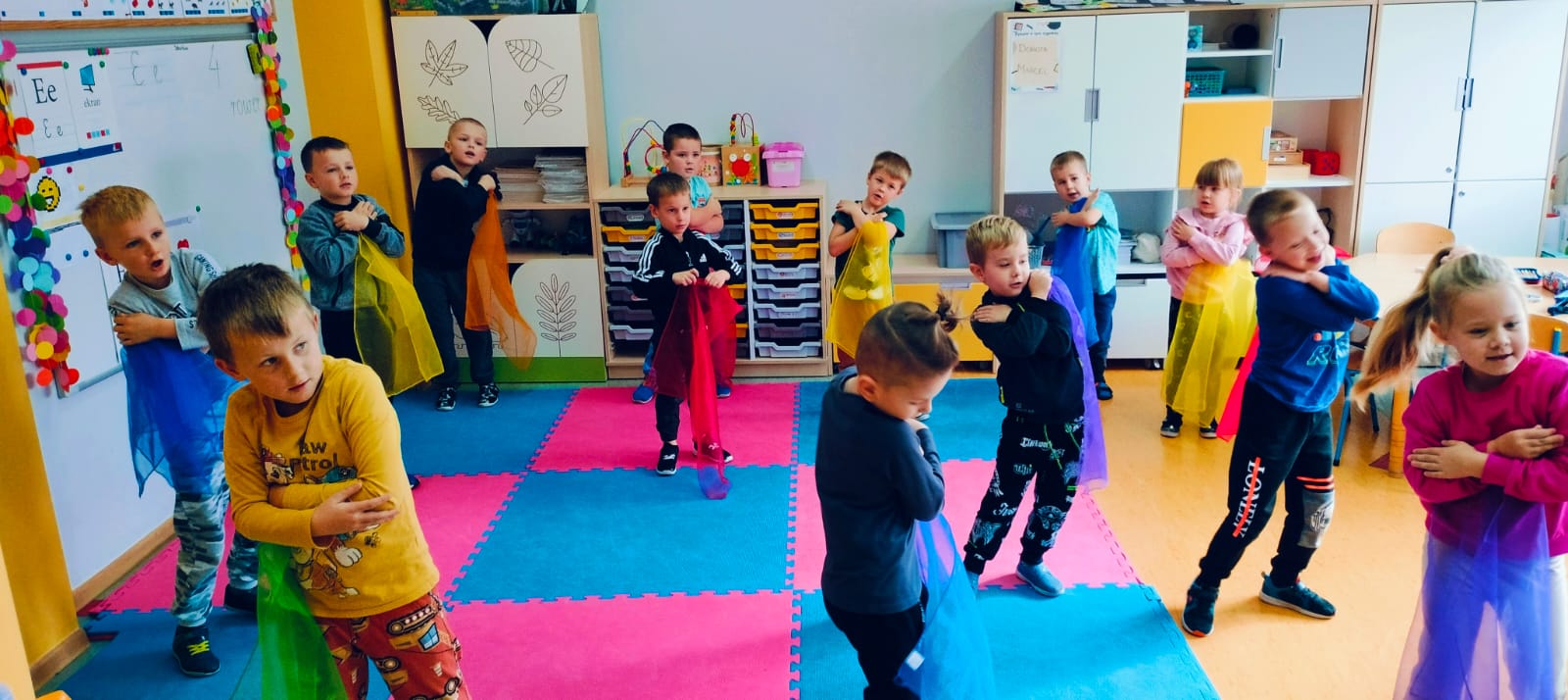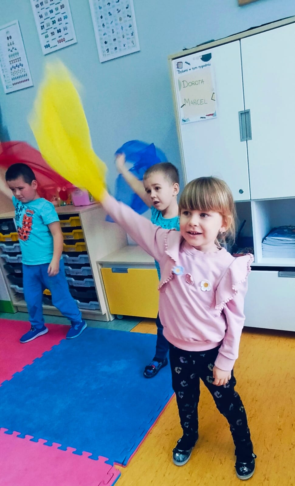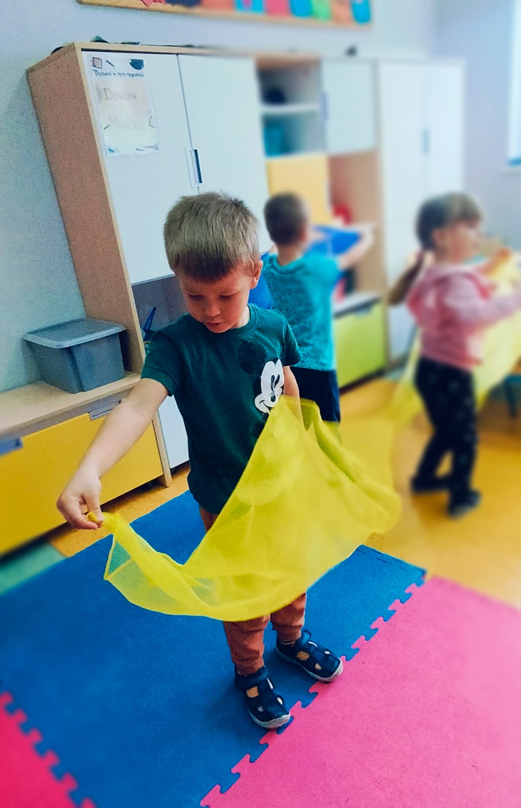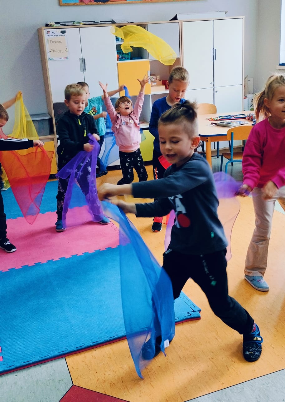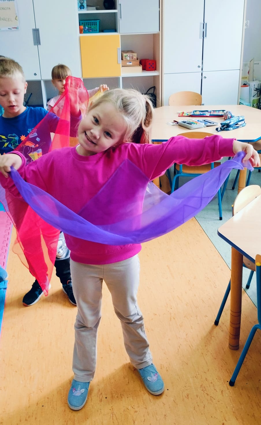 Jako rekwizyty posłużyły im dzisiaj kolorowe chusty, z pomocą których dzieci tworzyły interpretacje ruchowe wybranych utworów.
