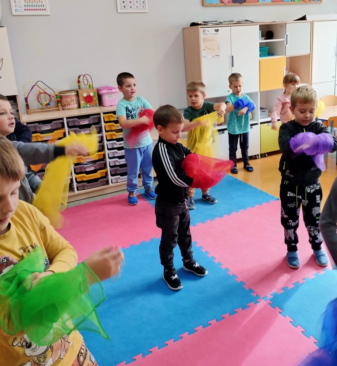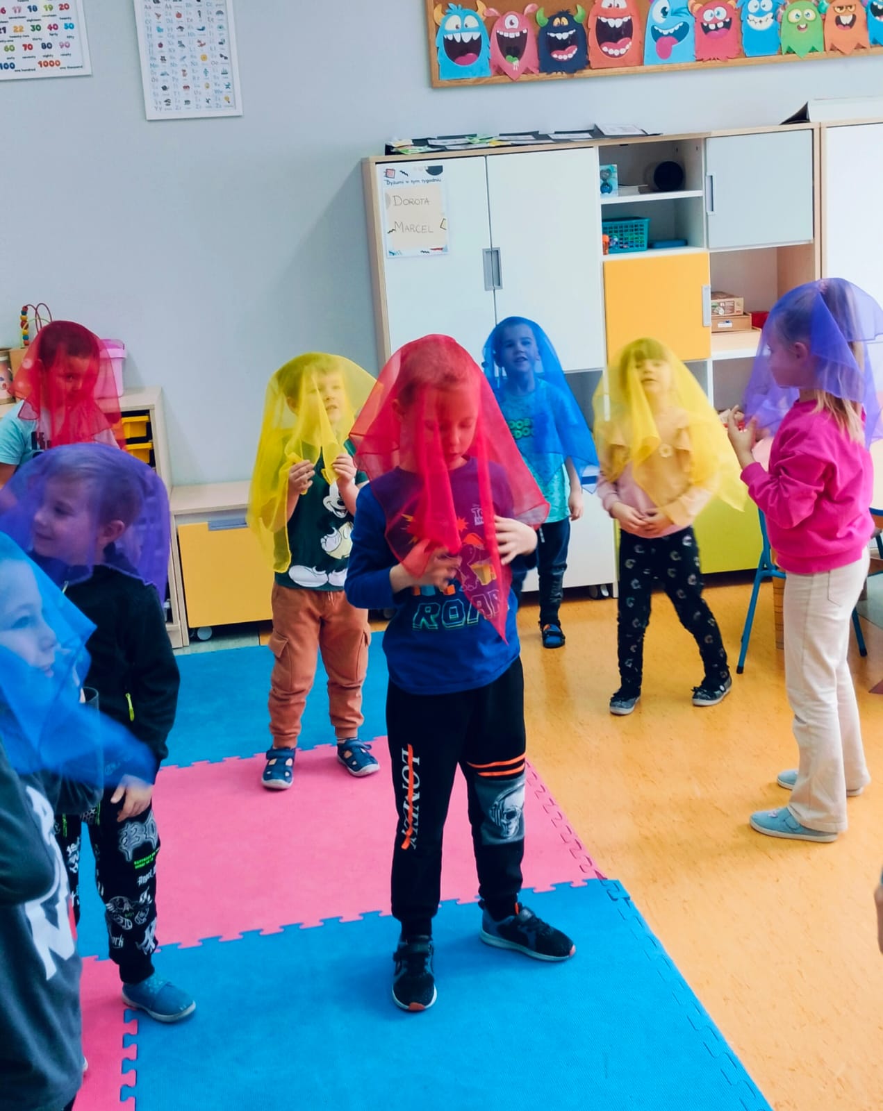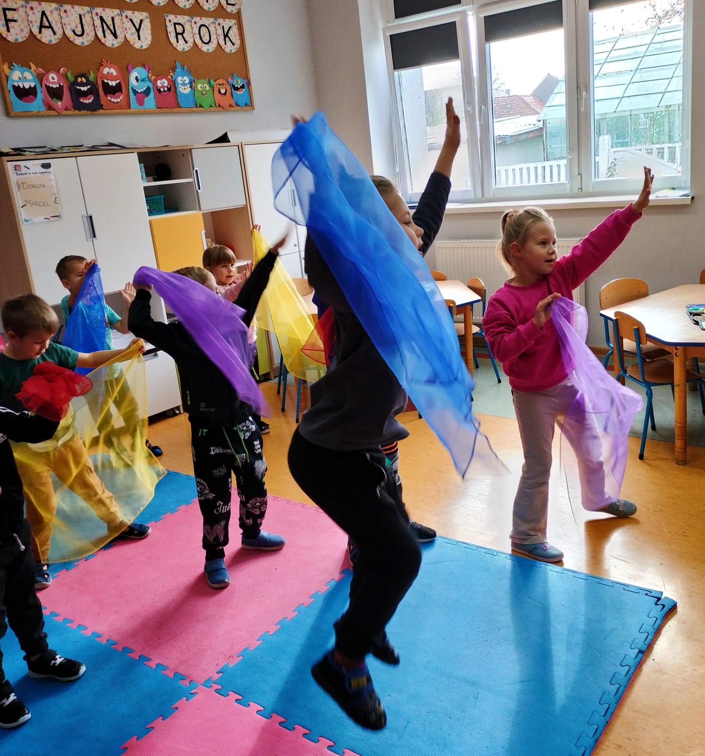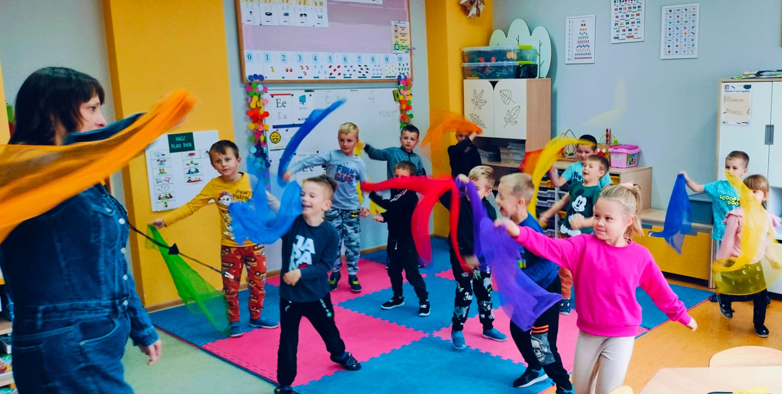 Jako rekwizyty posłużyły im dzisiaj kolorowe chusty, z pomocą których dzieci tworzyły interpretacje ruchowe wybranych utworów.