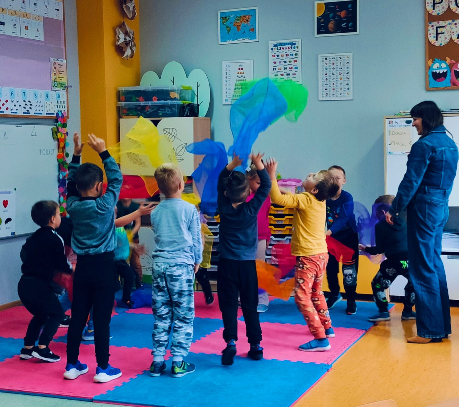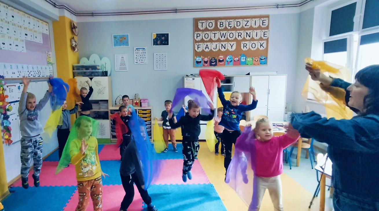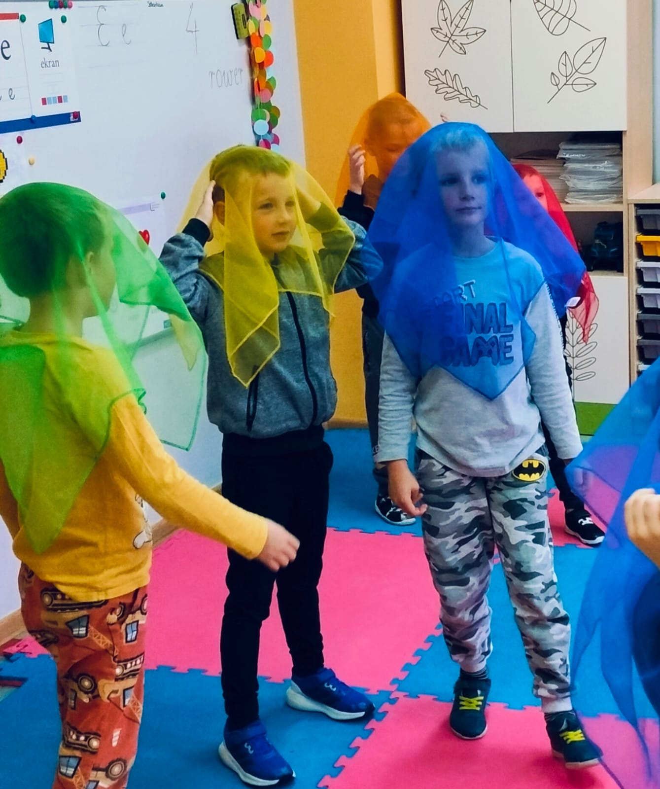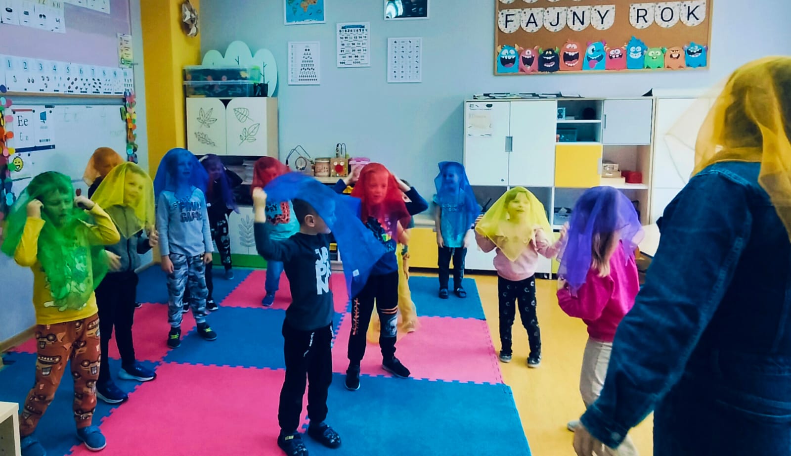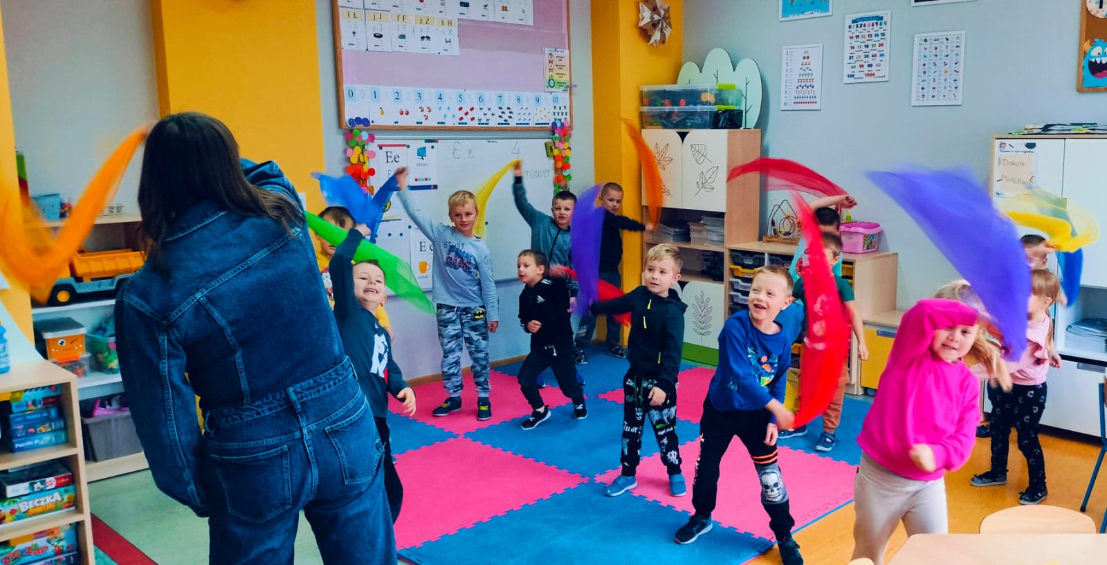 Jako rekwizyty posłużyły im dzisiaj kolorowe chusty, z pomocą których dzieci tworzyły interpretacje ruchowe wybranych utworów.