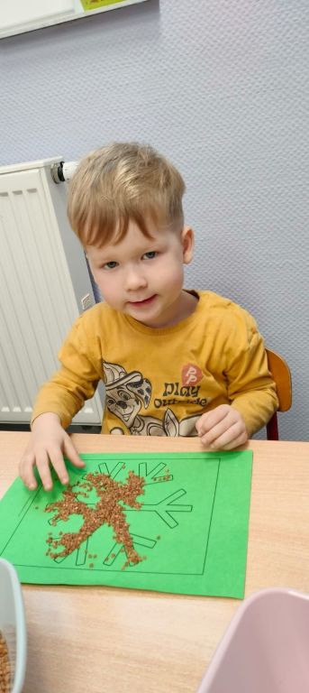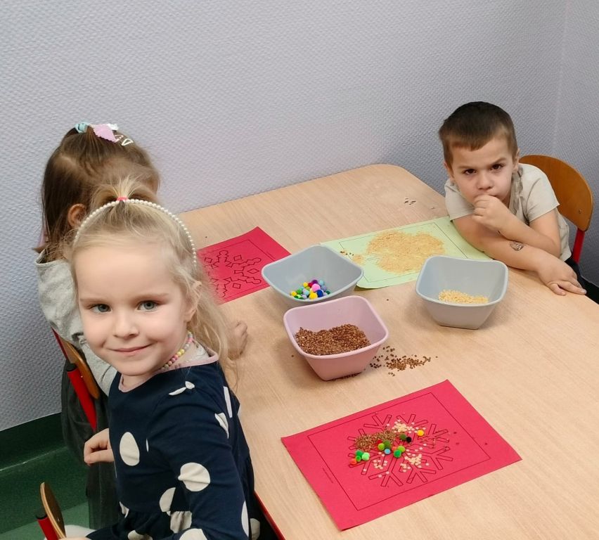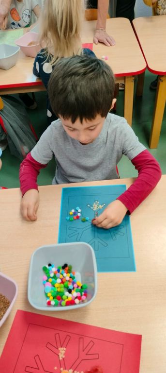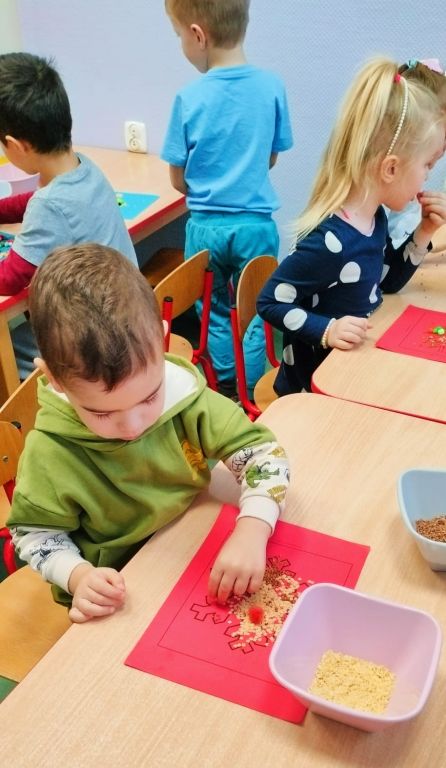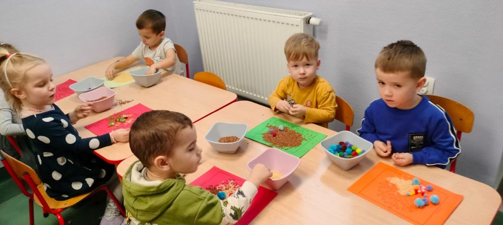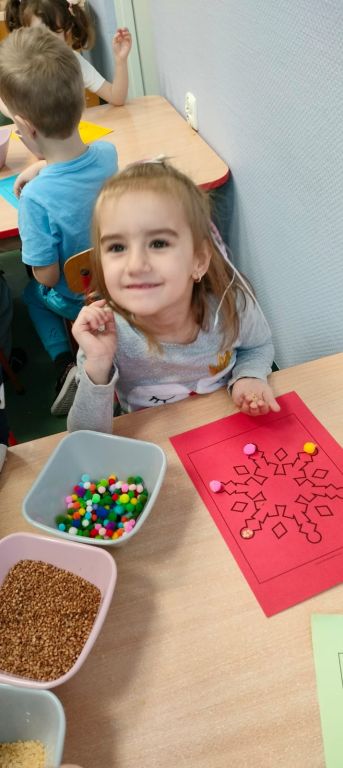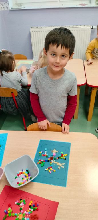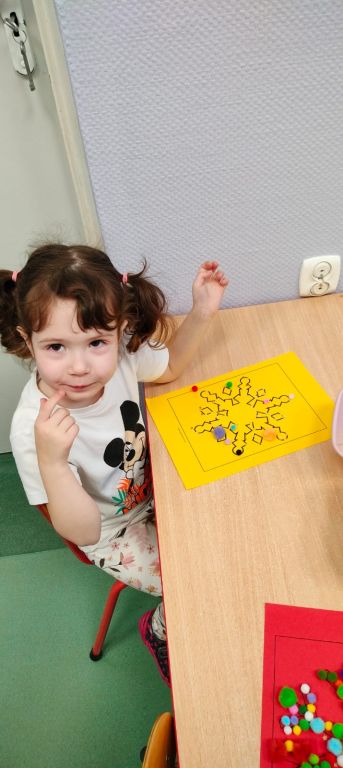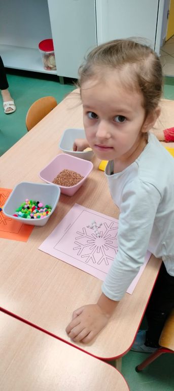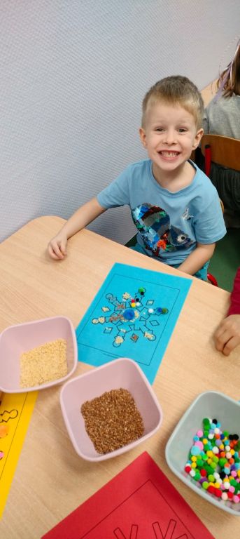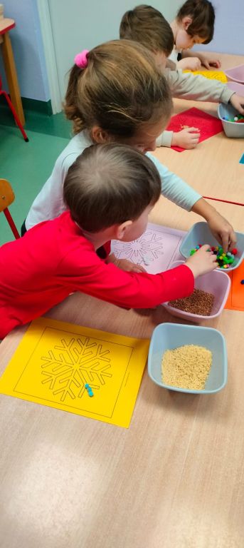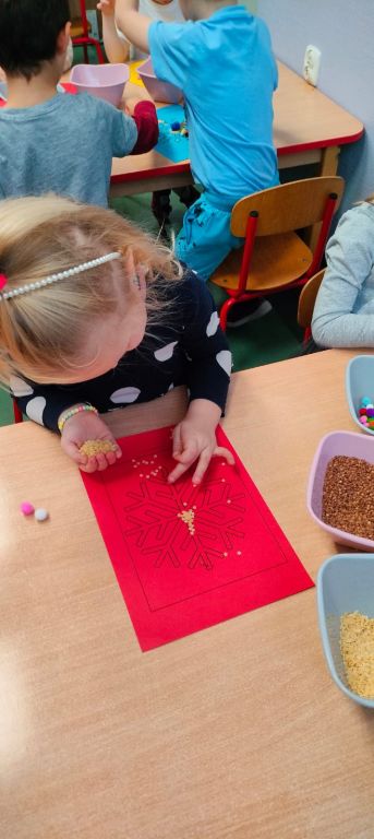 Dziś dzieci przekonały się, że kasza, makaron oraz różne produkty nie służą tylko do jedzenia🍴☺️.Ćwicząc swoje rączki na zajęciach sensoplastyki, dzieci tworzyły piękne, zimowe śnieżynki ❄️.Pastuszak B.