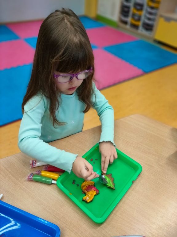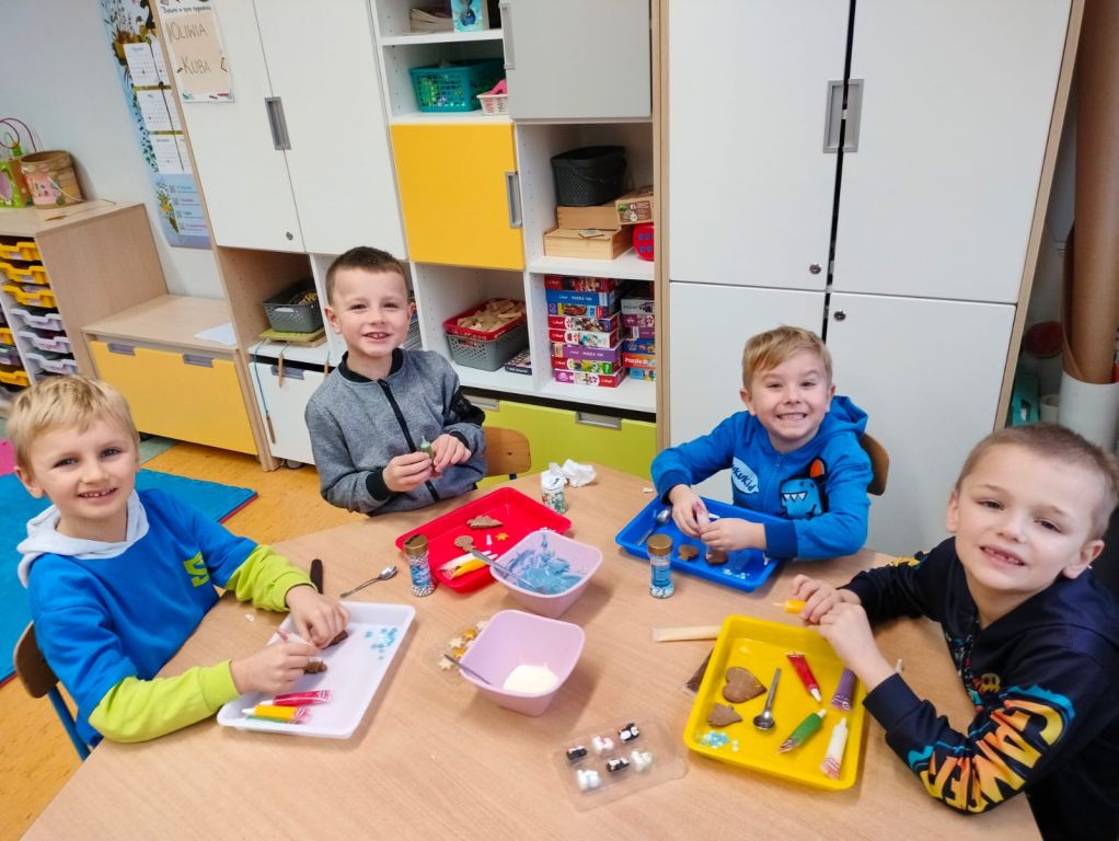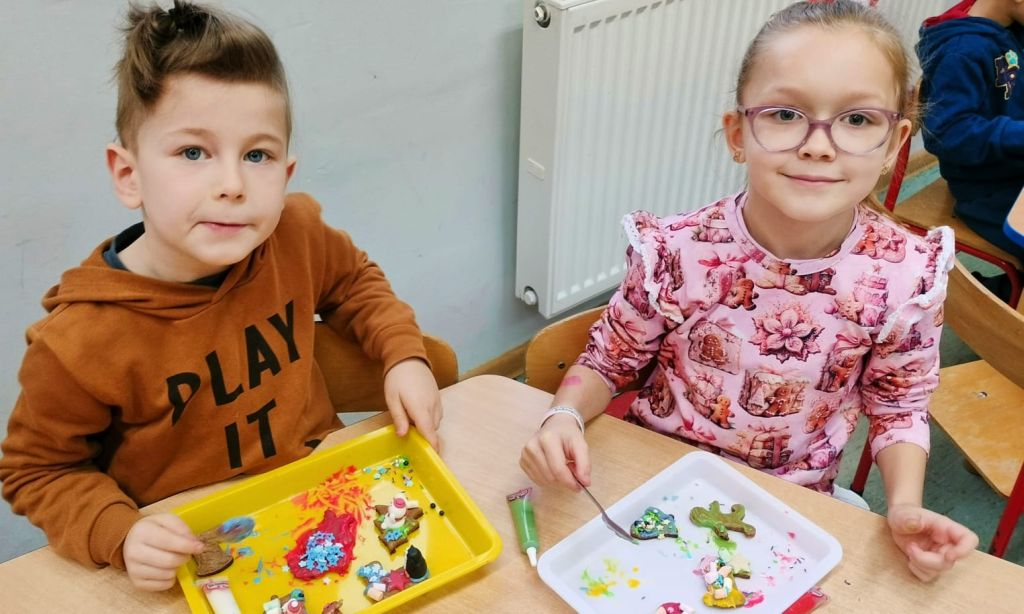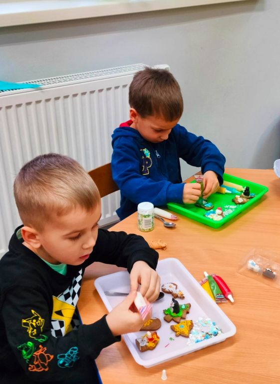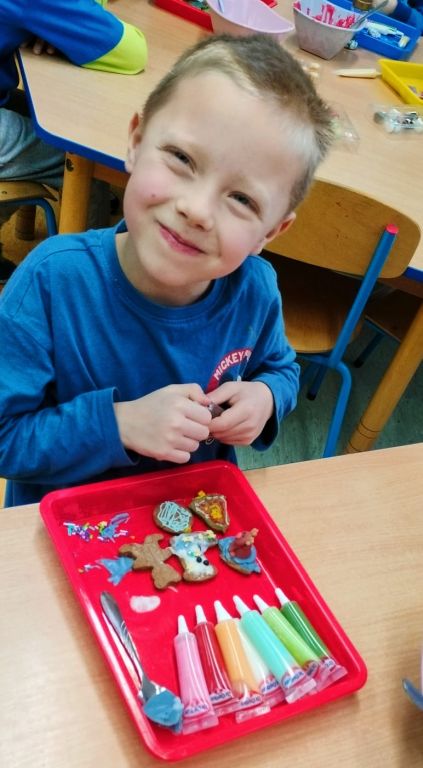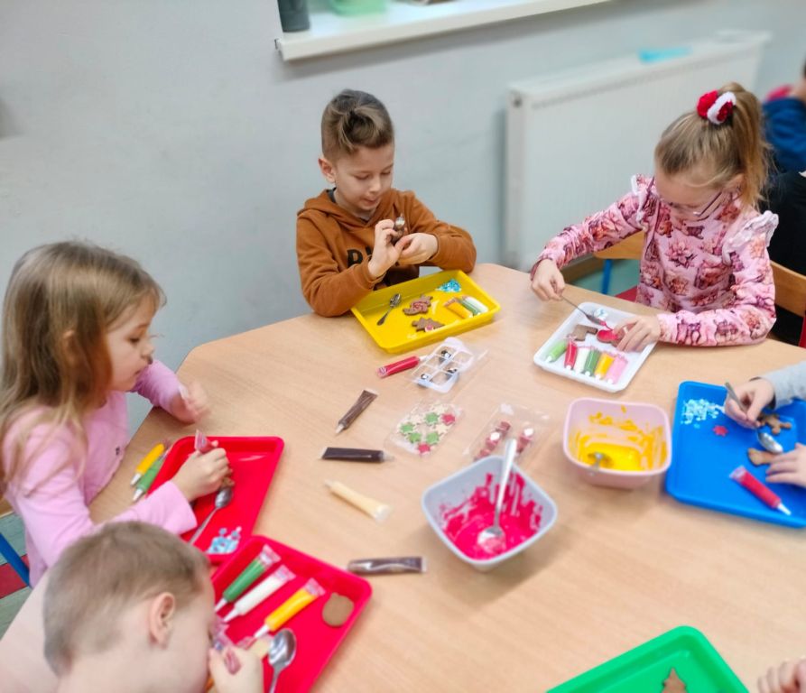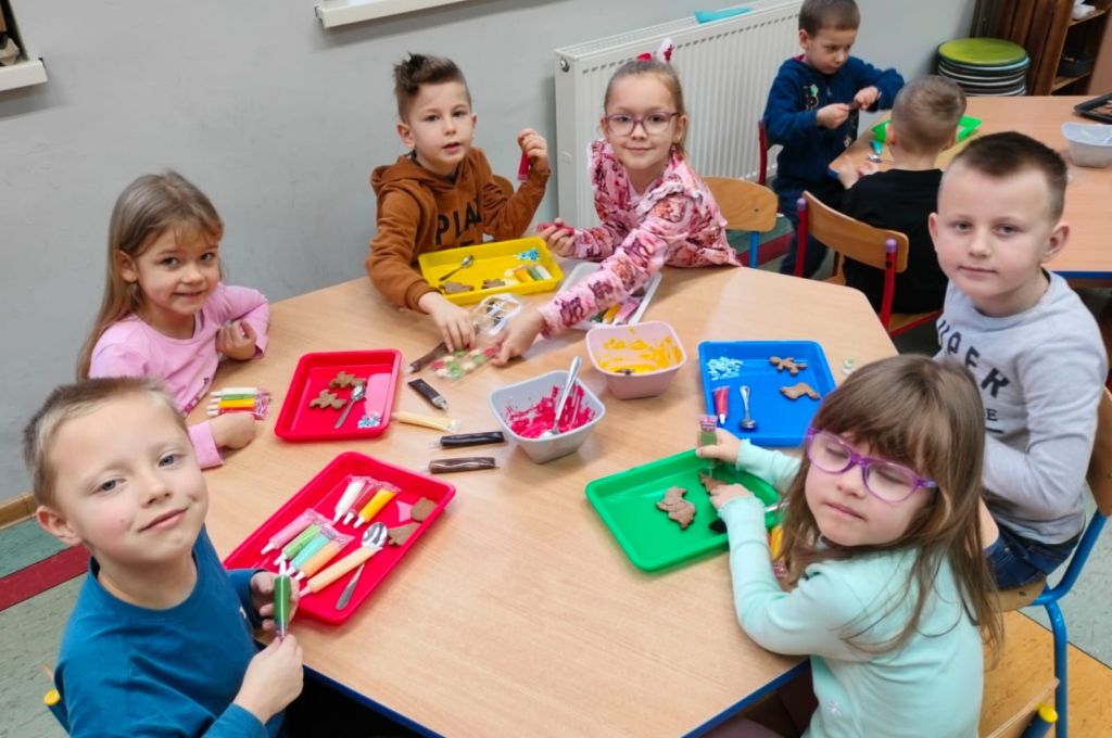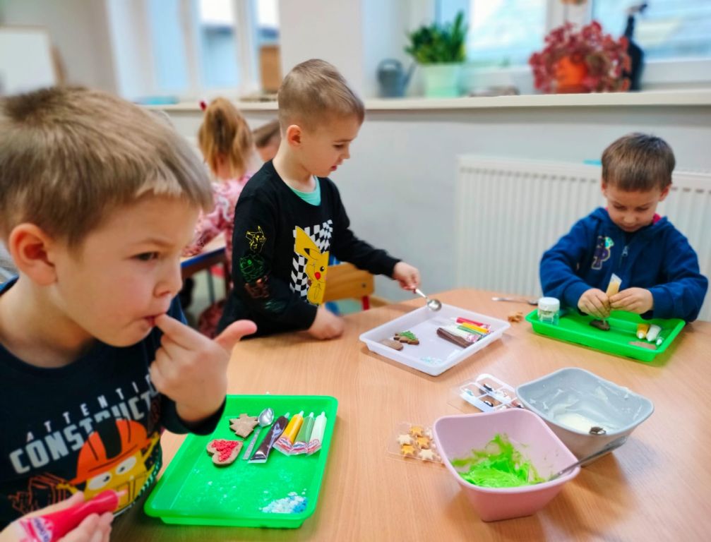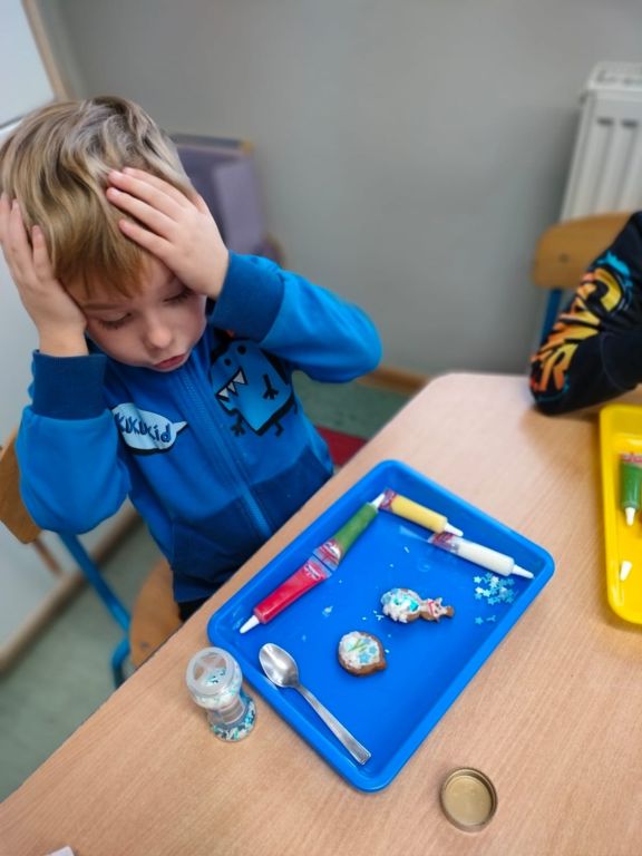 Sensoplastyka: uczniowie z zerówki ozdabiają pierniczki.