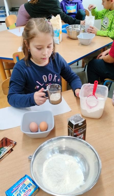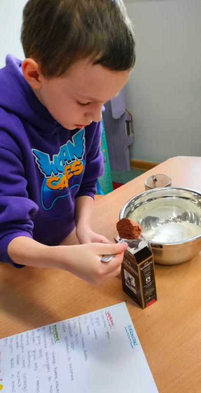 Korzystając z przepisu wykonali ciasto decydując, które składniki trzeba wsypać najpierw i jakie mają być ich proporcje.