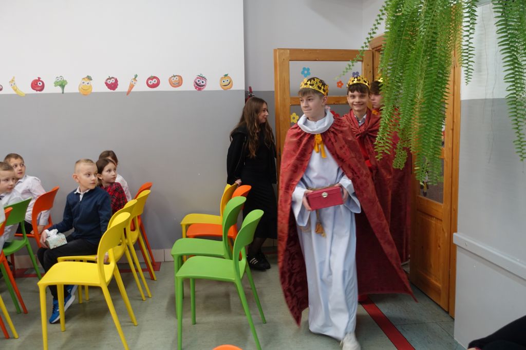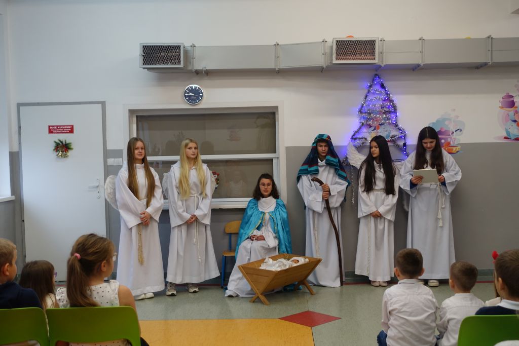 Uczniowie klasy 7 przpomnieli nam wydarzenia z betlejemskiej nocy, gdy narodził się Chrystus. Była więc stajenka z Maryją i Józefem, trzej królowie, pastuszkowie, dzieci witające nowonarodzone Dzieciątko. Nie zabrakło również wspólnego kolędowania i życzeń świątecznych składanych przez panią dyrektor i zaproszonych gości.
