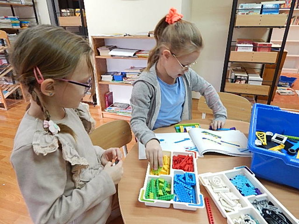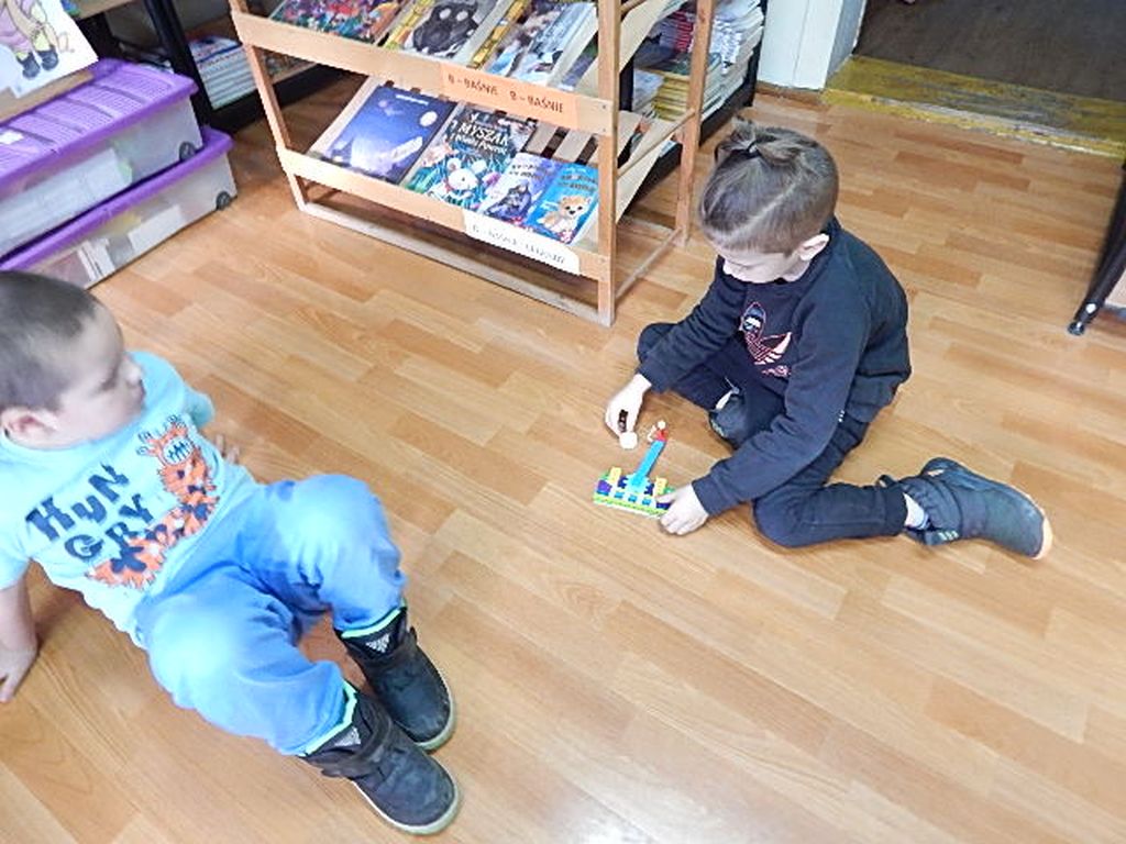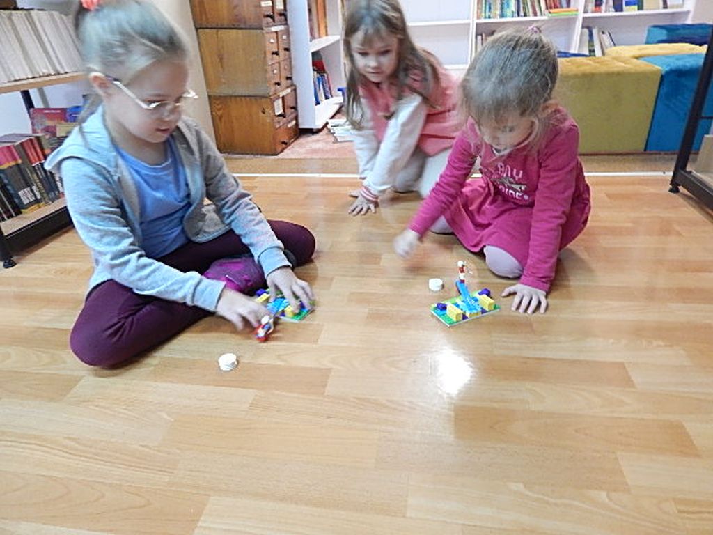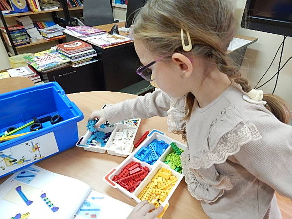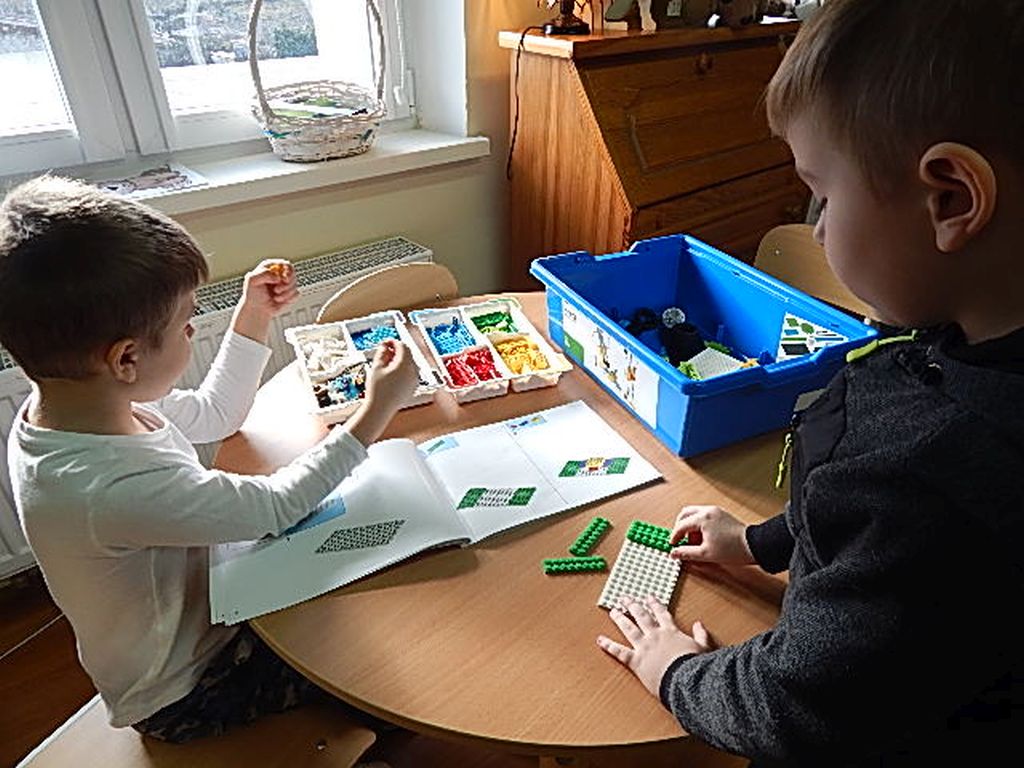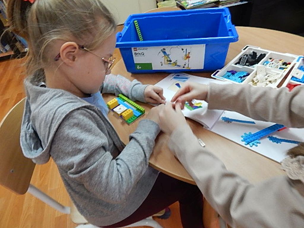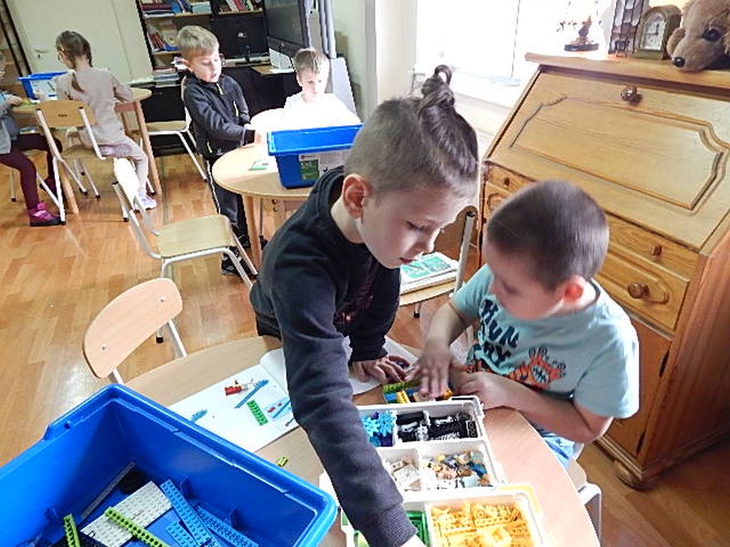 Na zajęciach robotyki dzieci między innymi uczą się pracy z algorytmem. Pomocne okazują się klocki Lego Education. Dzisiaj dzieci wykorzystywały koła zębate do uzyskania efektu ruchu. Budowa elementów była niezwykle absorbująca a późniejsza gra "w hokeja" sprawiła wiele radości.