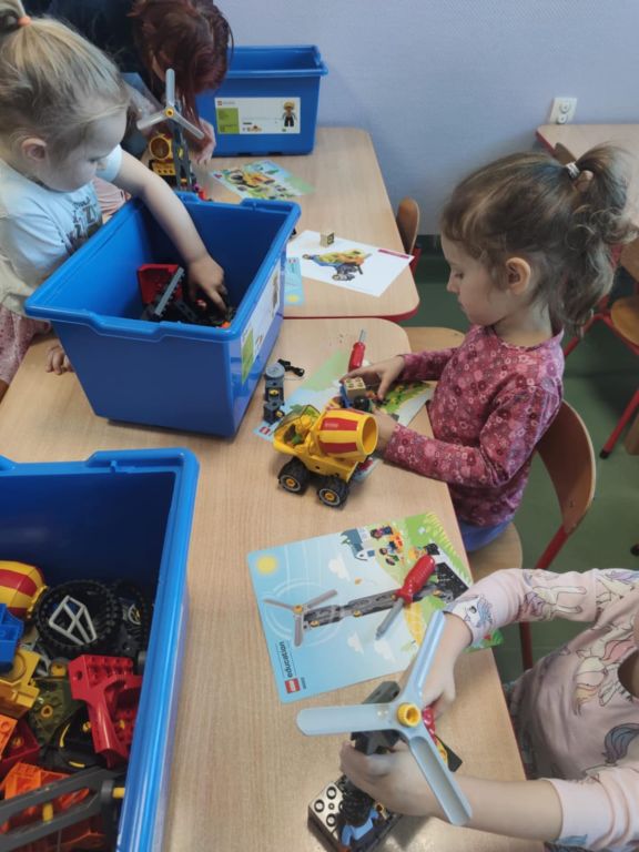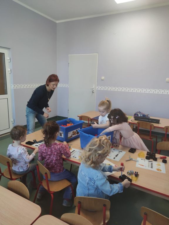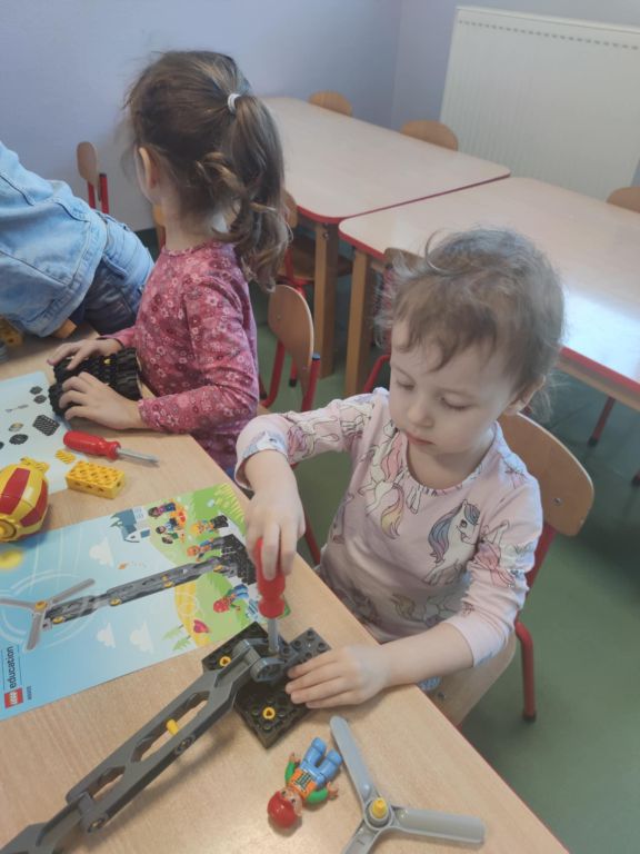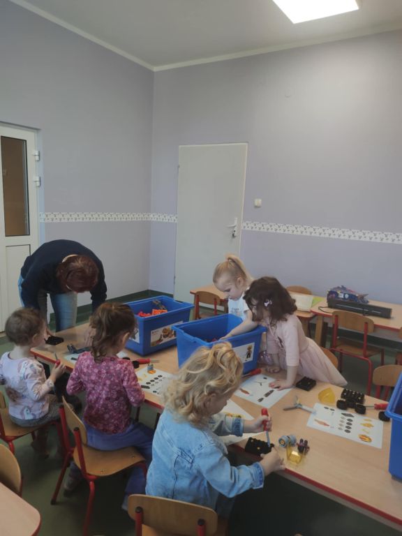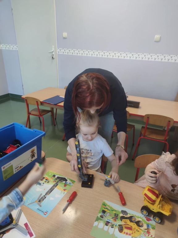Dzieci z przedszkola doskonale już radzą sobie ze śrubokrętem i konstruują różne maszyny. Na ostatnich zajęciach nasi inżynierowie budowali różne pojazdy i budowle wykorzystując własną wyobraźnię. Przy swoich konstrukcjach dzieci dbały o to by ich pojazd/budowla/robot były stabilne, bezpieczne i trwałe.