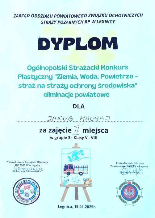 Z radością informujemy, że uczeń klasy VI - Jakub Machaj, zajął II miejsce w strażackim konkursie plastycznym.