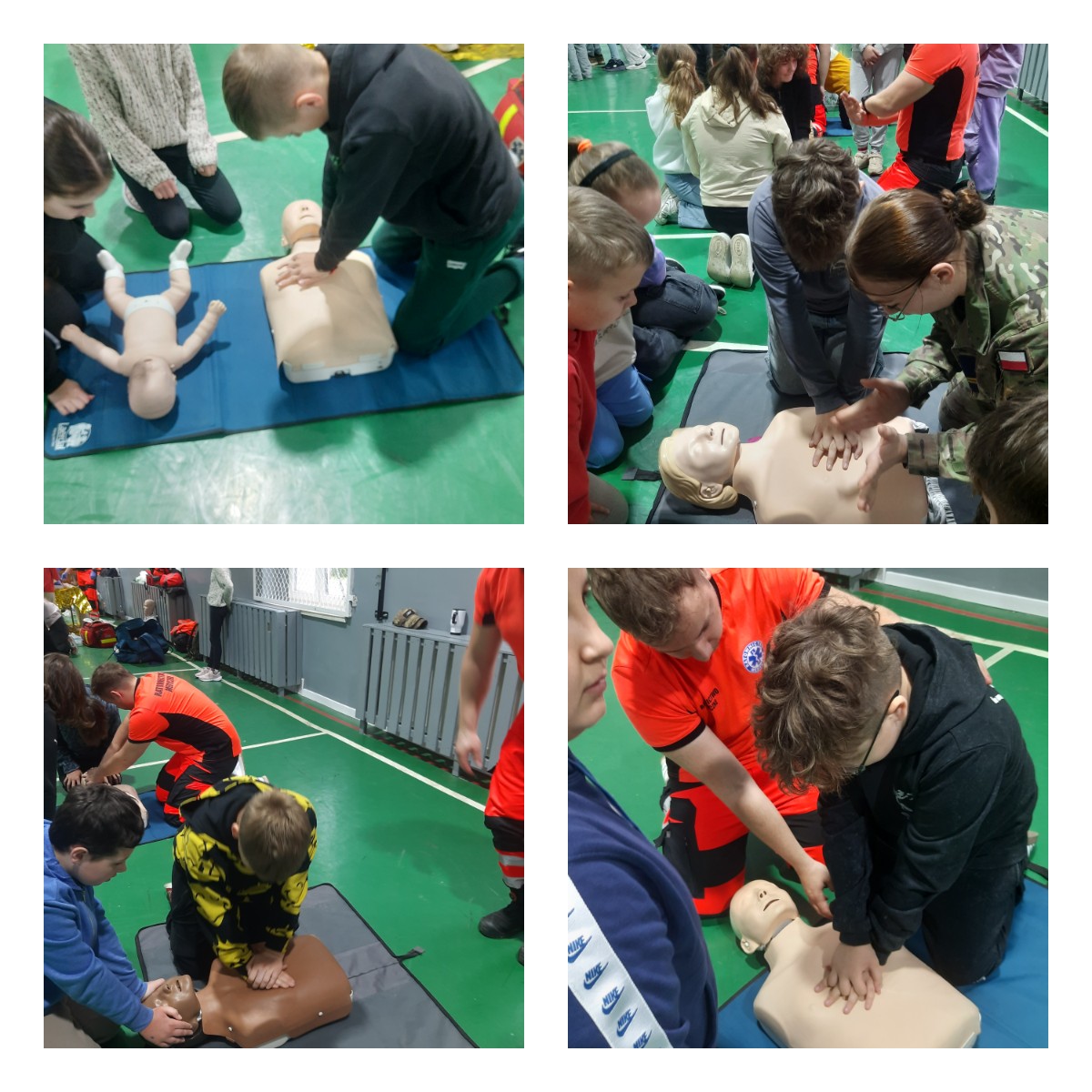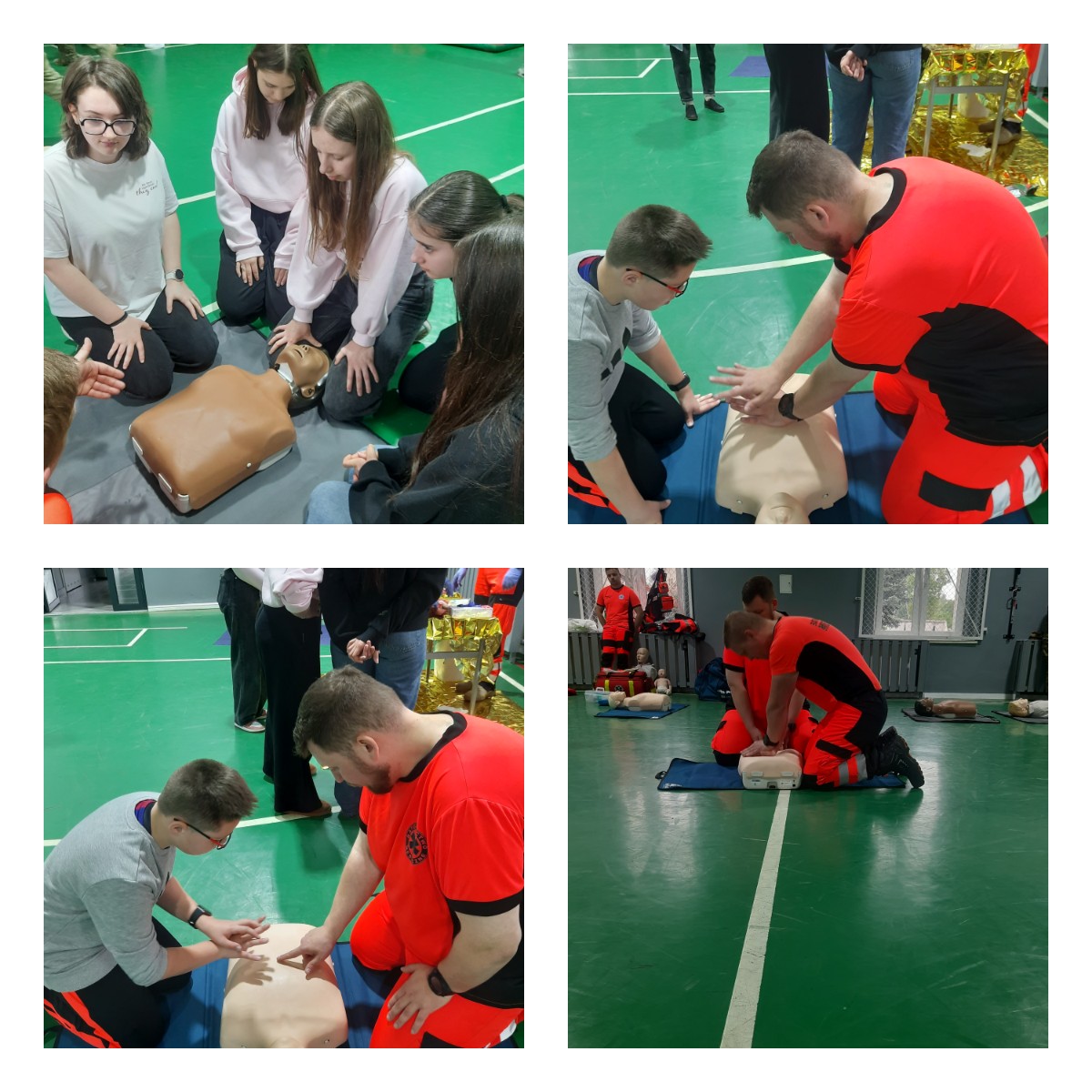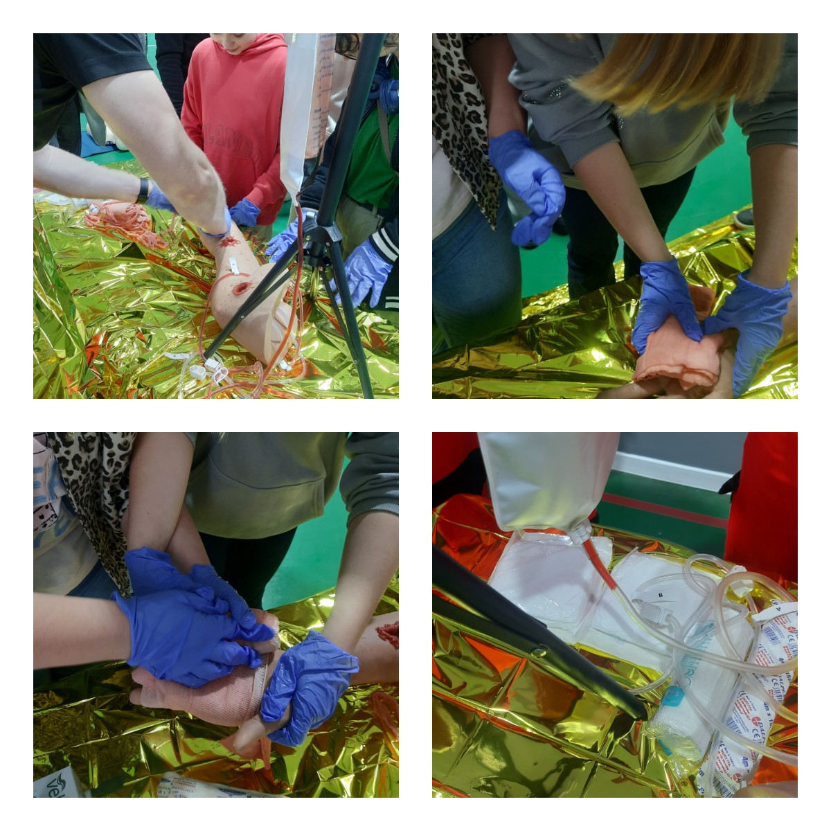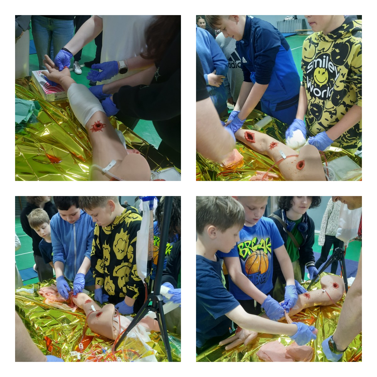 Nasi goście przygotowali różne stanowiska, na których uczniowie mogli ćwiczyć praktyczne umiejętności z udzielania pierwszej pomocy przedmedycznej. Każdy chętny uczeń mógł nauczyć się resuscytacji, opatrywania i usztywniania złamanych kończyn, opatrywania krwawiących ran czy też udzielenia pomocy w przypadku zadławienia.