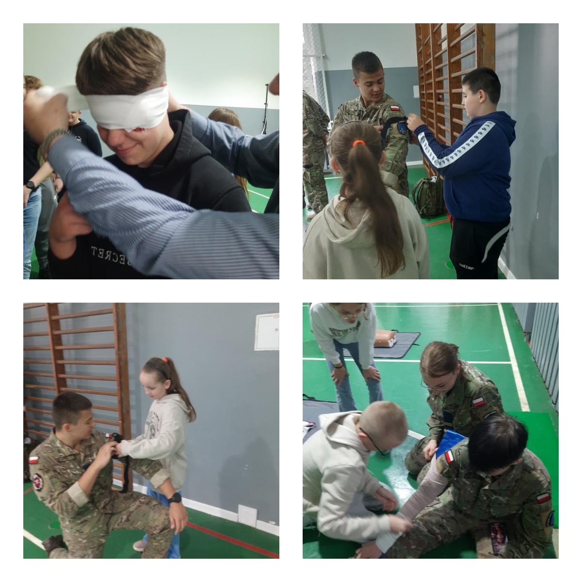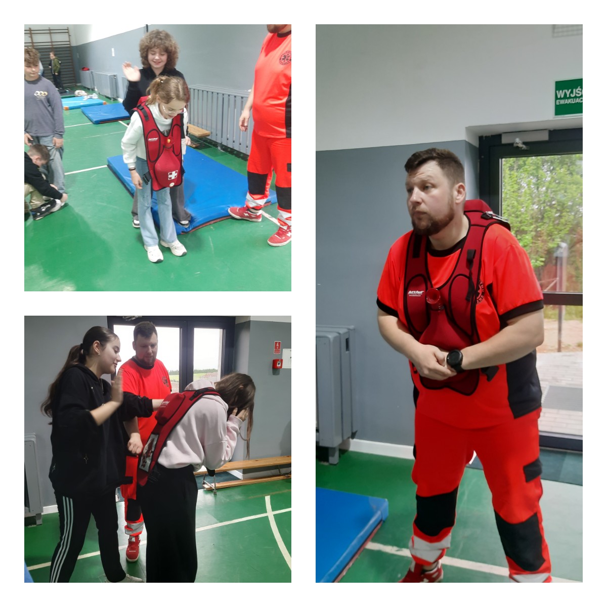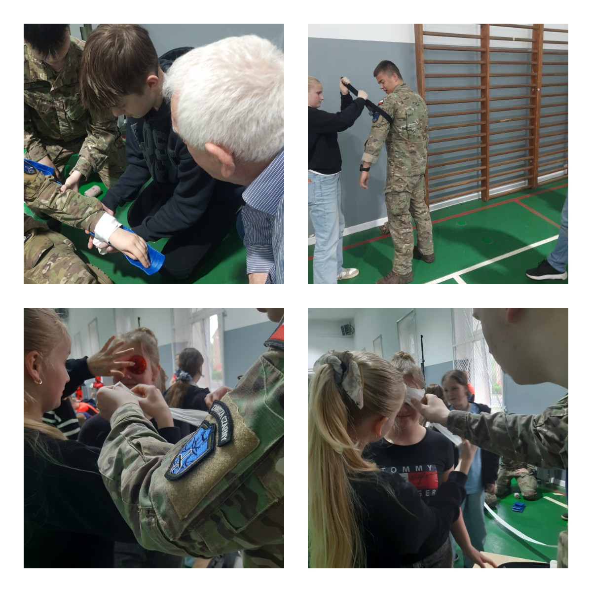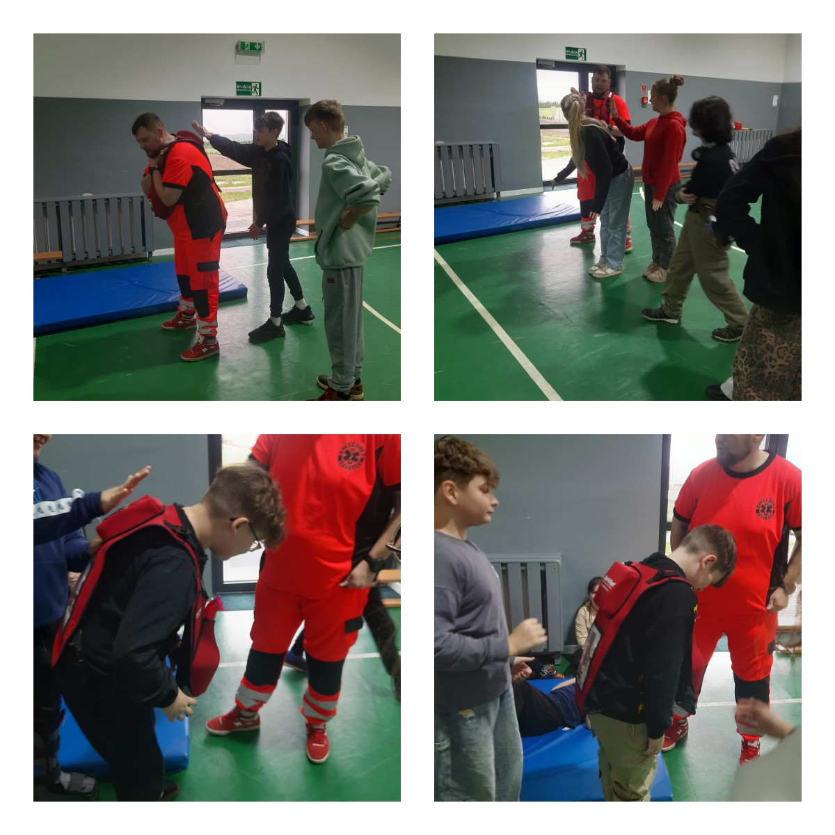 Nasi goście przygotowali różne stanowiska, na których uczniowie mogli ćwiczyć praktyczne umiejętności z udzielania pierwszej pomocy przedmedycznej. Każdy chętny uczeń mógł nauczyć się resuscytacji, opatrywania i usztywniania złamanych kończyn, opatrywania krwawiących ran czy też udzielenia pomocy w przypadku zadławienia.