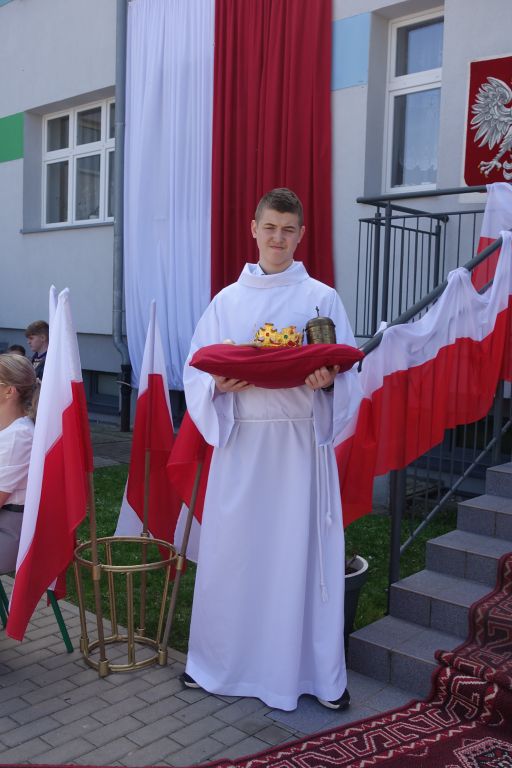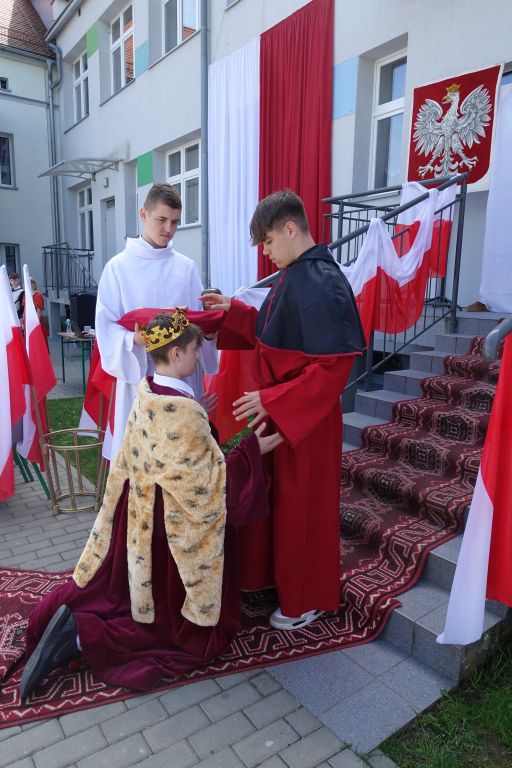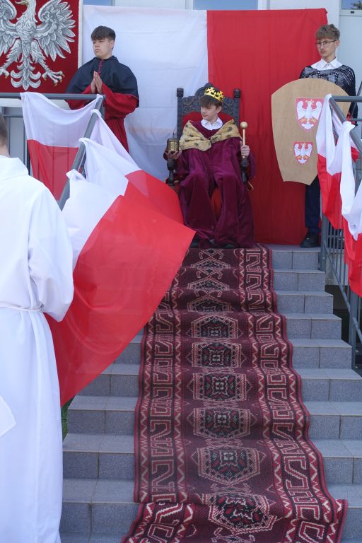 W tym dniu uczniowie, nauczyciele, pracownicy szkoły i zaproszeni goście mieli zaszczyt poznać księcia/króla Bolesława Chrobrego, który osobiście przybył do naszej szkoły i dostojnym krokiem, po dywanie, w otoczeniu dworzan, mnichów i wojów, przechadzał się po placu szkolnym, pozdrawiając wszystkich zebranych.