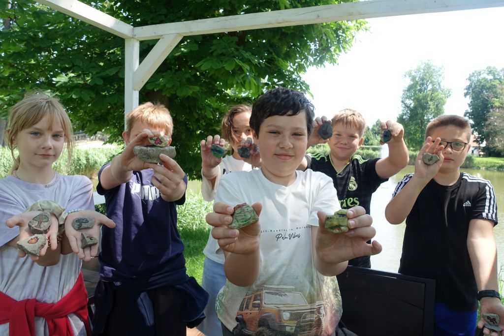 𝗞𝗹𝗮𝘀𝗮 𝗩𝗜 na angielskim tworzyła swoje terenowe słowniki. Na języku polskim zawędrowała nad rzekę, gdzie również powstały kamyczkowe story cubes. W czasie wędrówki uczniowie dzielili się z nauczycielem ciekawostkami o historii swojej miejscowości.