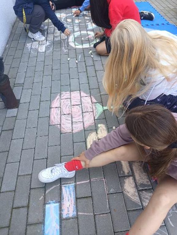 𝗞𝗹𝗮𝘀𝗮 𝗩𝗜𝗜 na języku polskim przypomniała sobie motywy z „Małego Księcia”, malując kredą piękne ilustracje nawiązujące do lektury. Na historii uczniowie tworzyli ze swoich ciał daty ważnych wydarzeń historycznych oraz układali puzzle, w których ukryły się postacie historyczne.