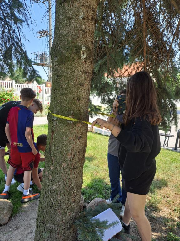𝗞𝗹𝗮𝘀𝗮 𝗩𝗜𝗜𝗜 intensywnie pracowała nad obliczeniami matematycznymi – uczniowie wyznaczali wysokość i przybliżony wiek drzew. Dzięki temu dowiedzieliśmy się, że nasza szkolna wierzba prawdopodobnie rośnie na tym terenie od około 80 lat.