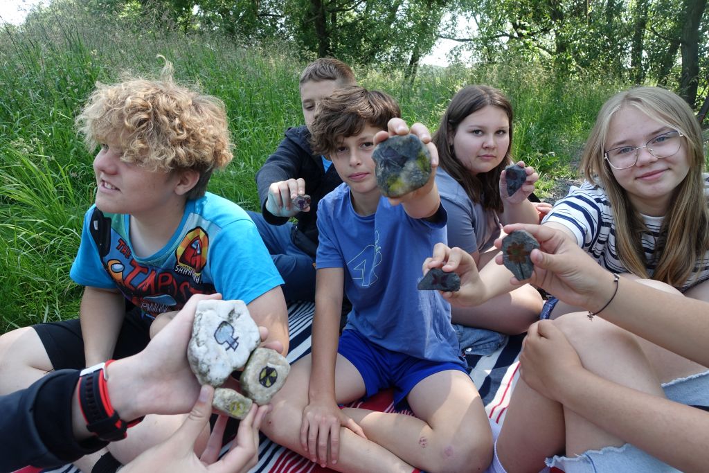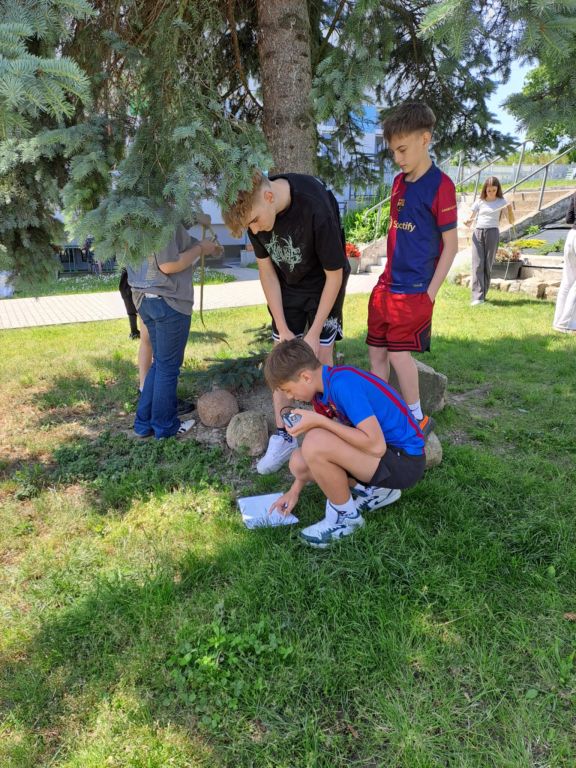 𝗞𝗹𝗮𝘀𝗮 𝗩 dotleniła się za wszystkie czasy – udało jej się spędzić każdą lekcję na świeżym powietrzu. Na biologii uczniowie zamienili się w prawdziwych mistrzów zapachów, tworząc własne koktajle zapachowe z roślin. Na języku polskim uczyli się opowiadać historie, bawiąc się w kamyczkowe story cubes, które samodzielnie zebrali i pomalowali.