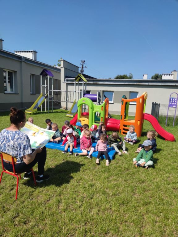 𝗣𝗿𝘇𝗲𝗱𝘀𝘇𝗸𝗼𝗹𝗮𝗸𝗶, które najczęściej z nas wszystkich korzystają z zabaw na świeżym powietrzu, dziś zasłuchiwały się w bajki czytane przez wychowawców.