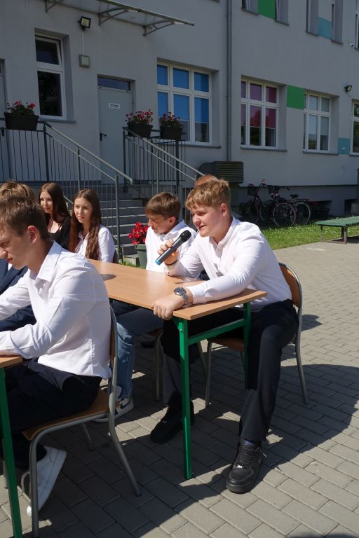 Ósmoklasiści, wraz ze swoim wychowawcą, przygotowali przedstawienie, w którym w żartobliwy sposób pokazali, jak wyglądały ich lekcje.