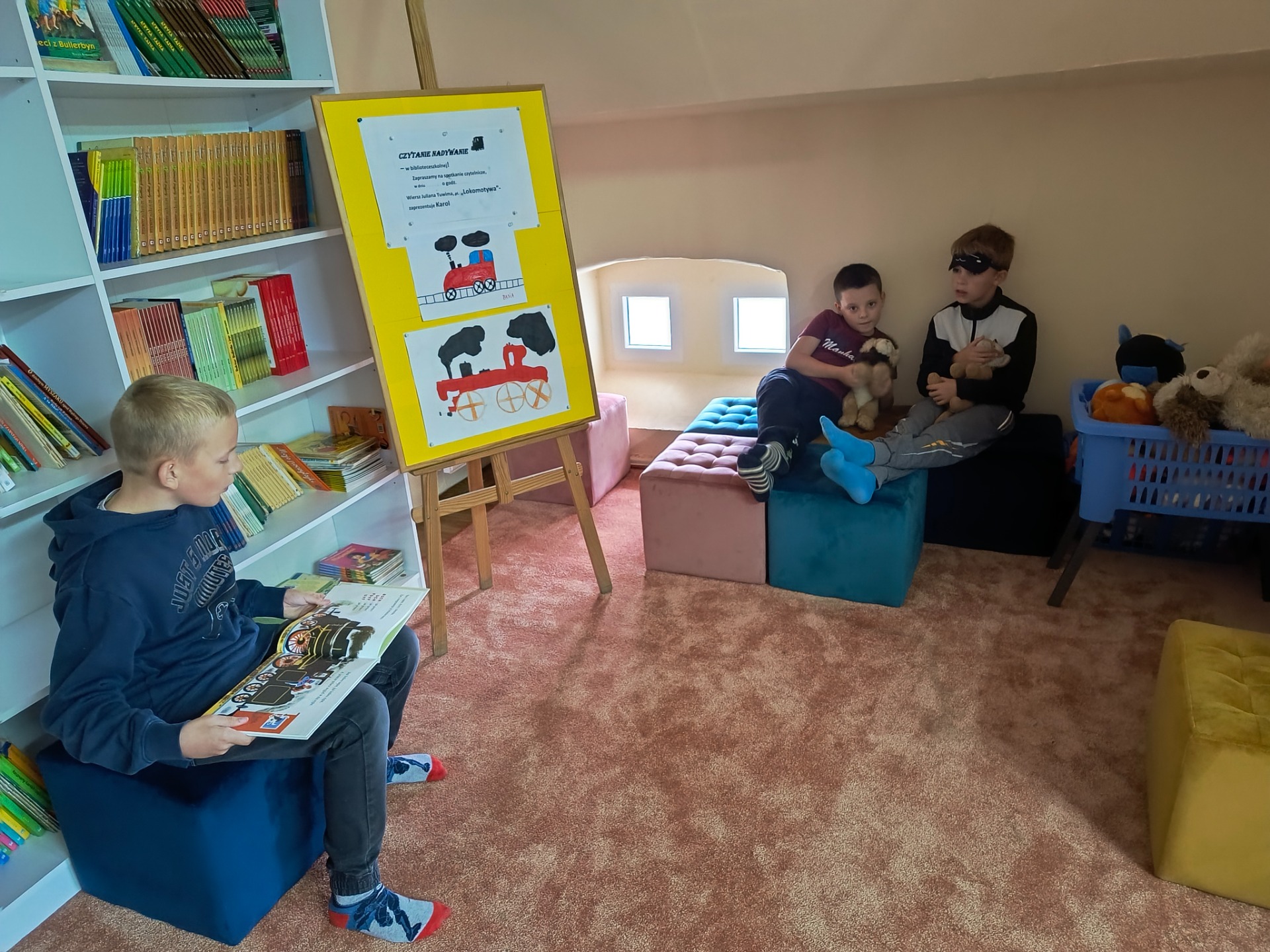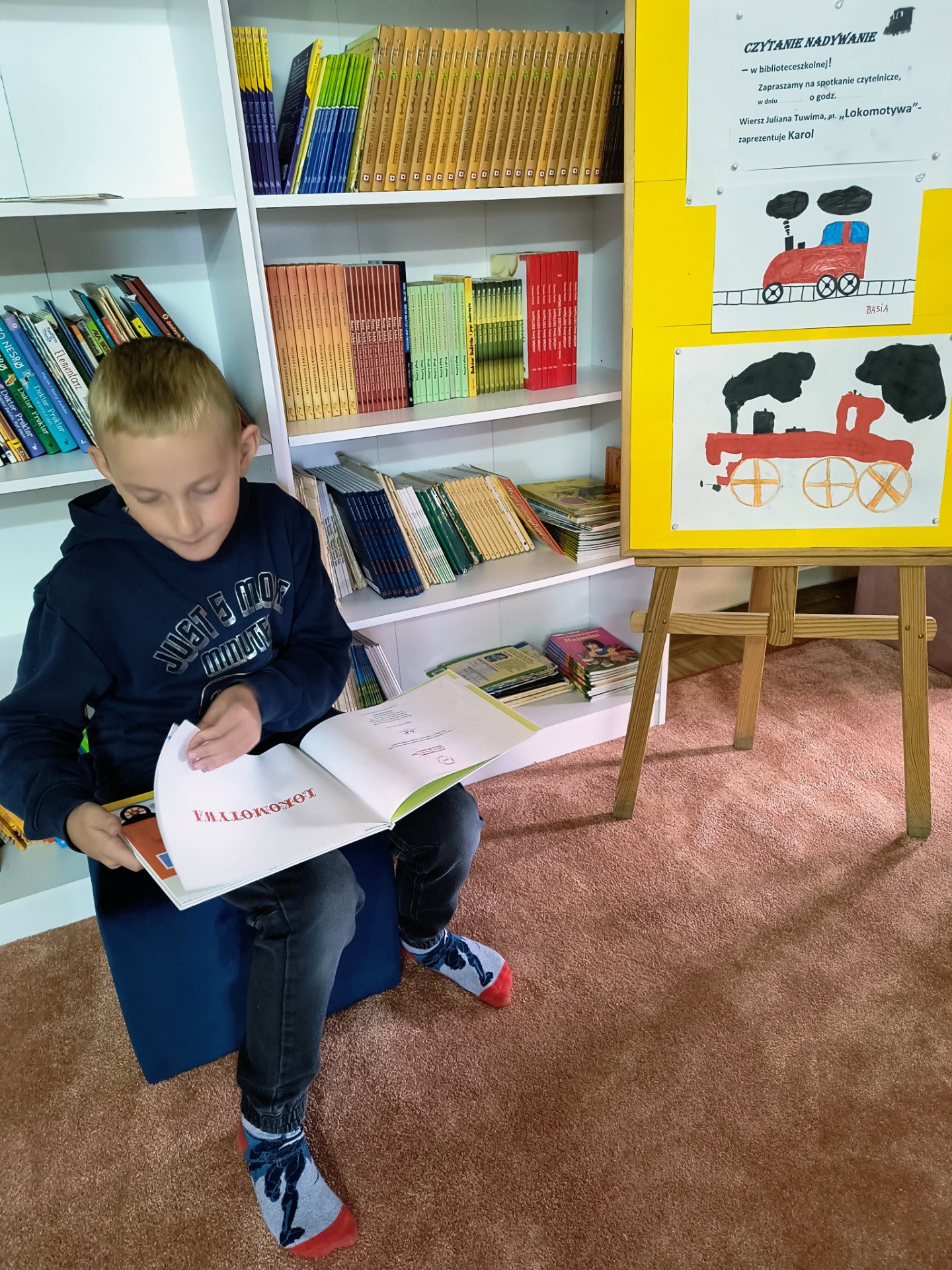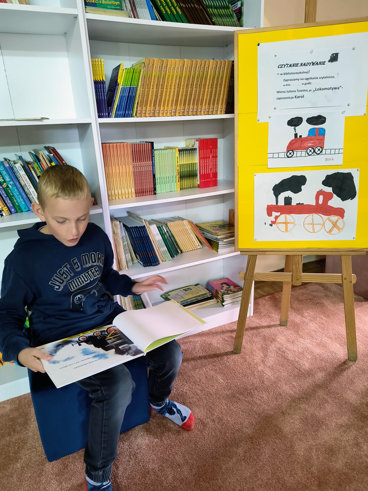 W czwartek, 25.09.2025 r. - w bibliotece szkolnej rozpoczął się cykl spotkań czytelniczych. Karol przygotował dekorację, zaprosił kolegów i zaprezentował swój ulubiony wiersz Juliana Tuwima - "Lokomotywa". Spotkanie zatytułowane przez prowadzącego - "Czytanie na dywanie", przebiegło w niezwykle przyjaznej atmosferze. Mam nadzieję, że będzie to zachętą dla innych uczniów. Zarówno czytanie jak i słuchanie jest sztuką. Karolu - dziękuję za zorganizowanie spotkania i ciekawą interpretację wiersza, który nie jest łatwy.