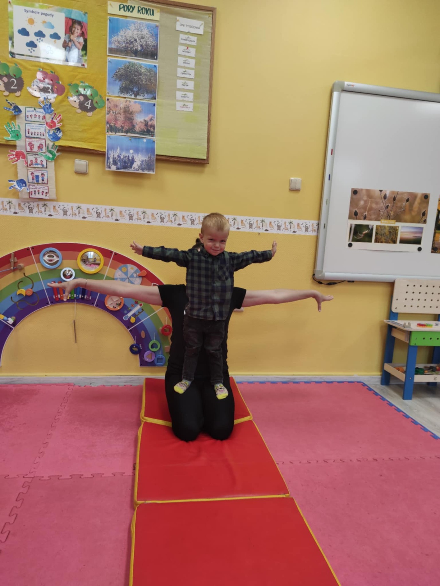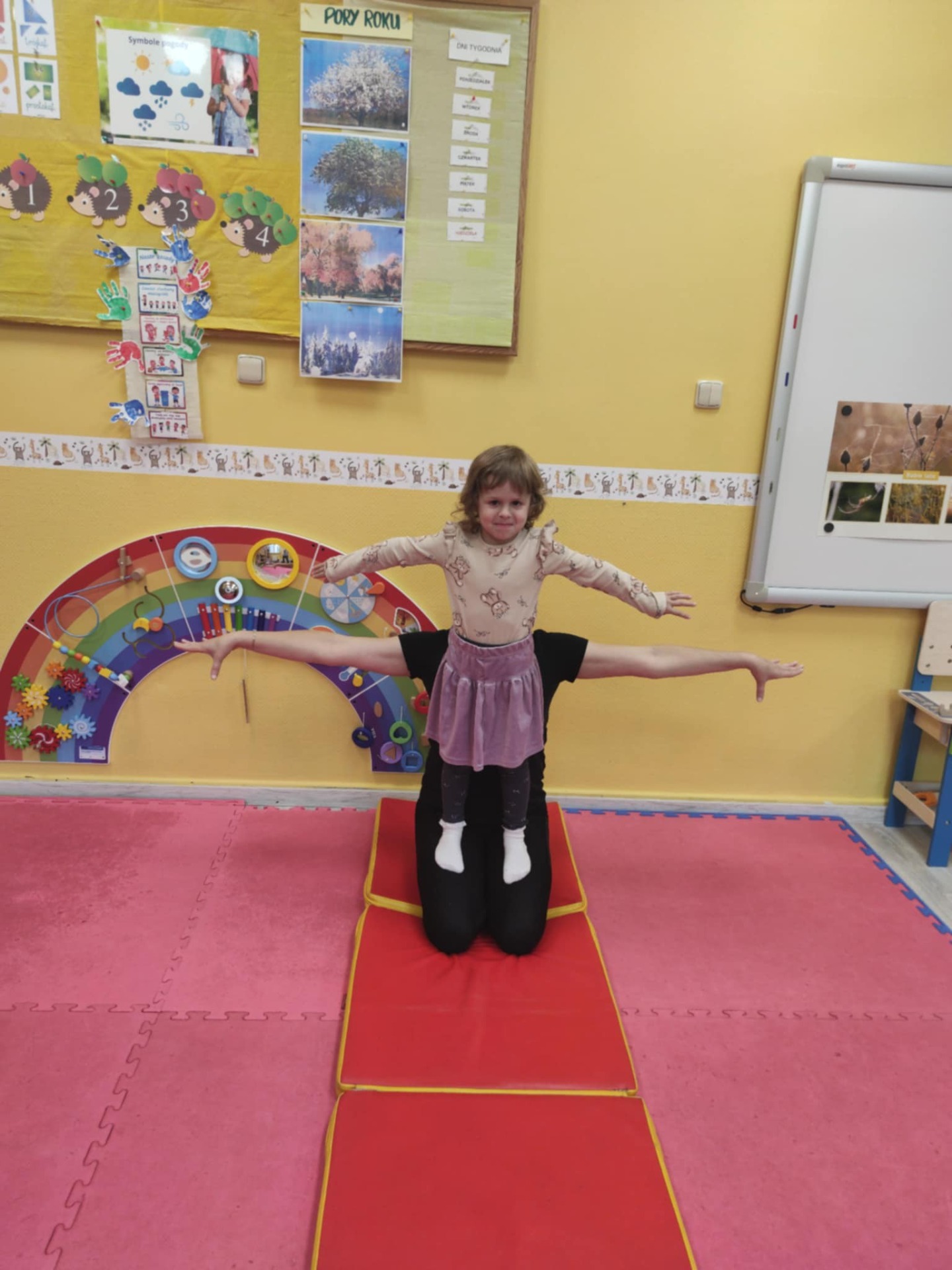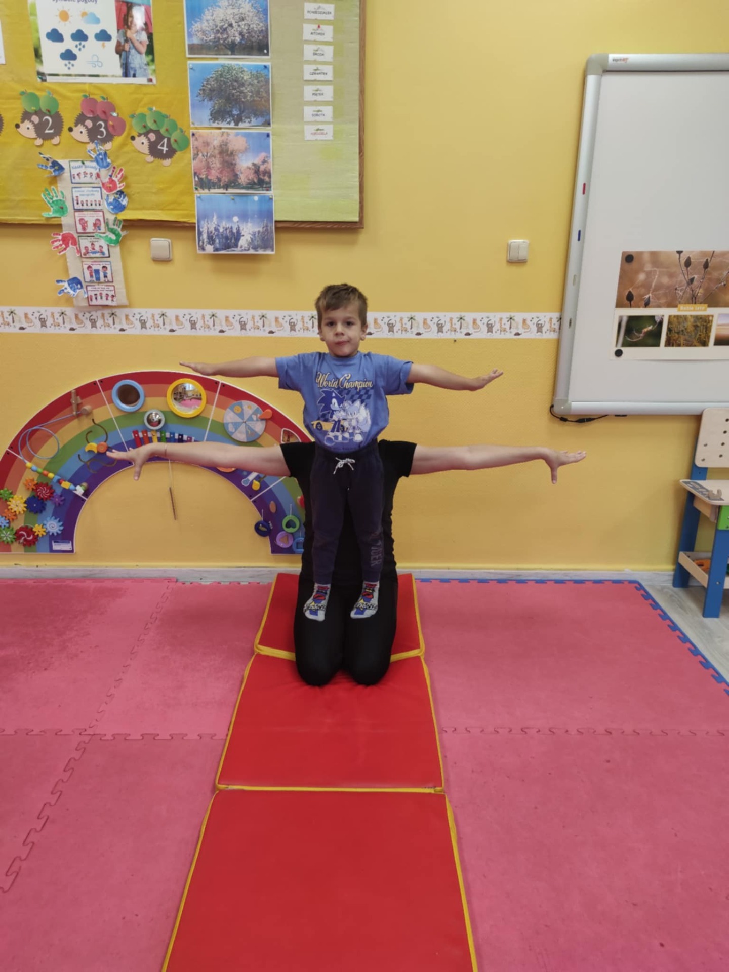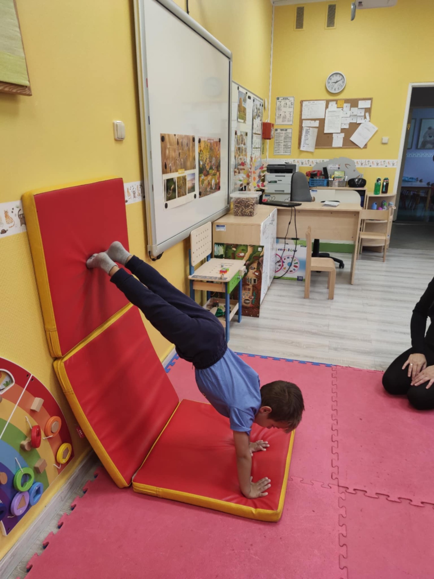 Dzieci z przedszkola zdobywają nowe umiejętności na zajęciach akrobatycznych.