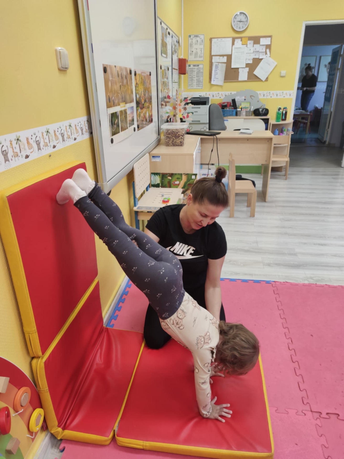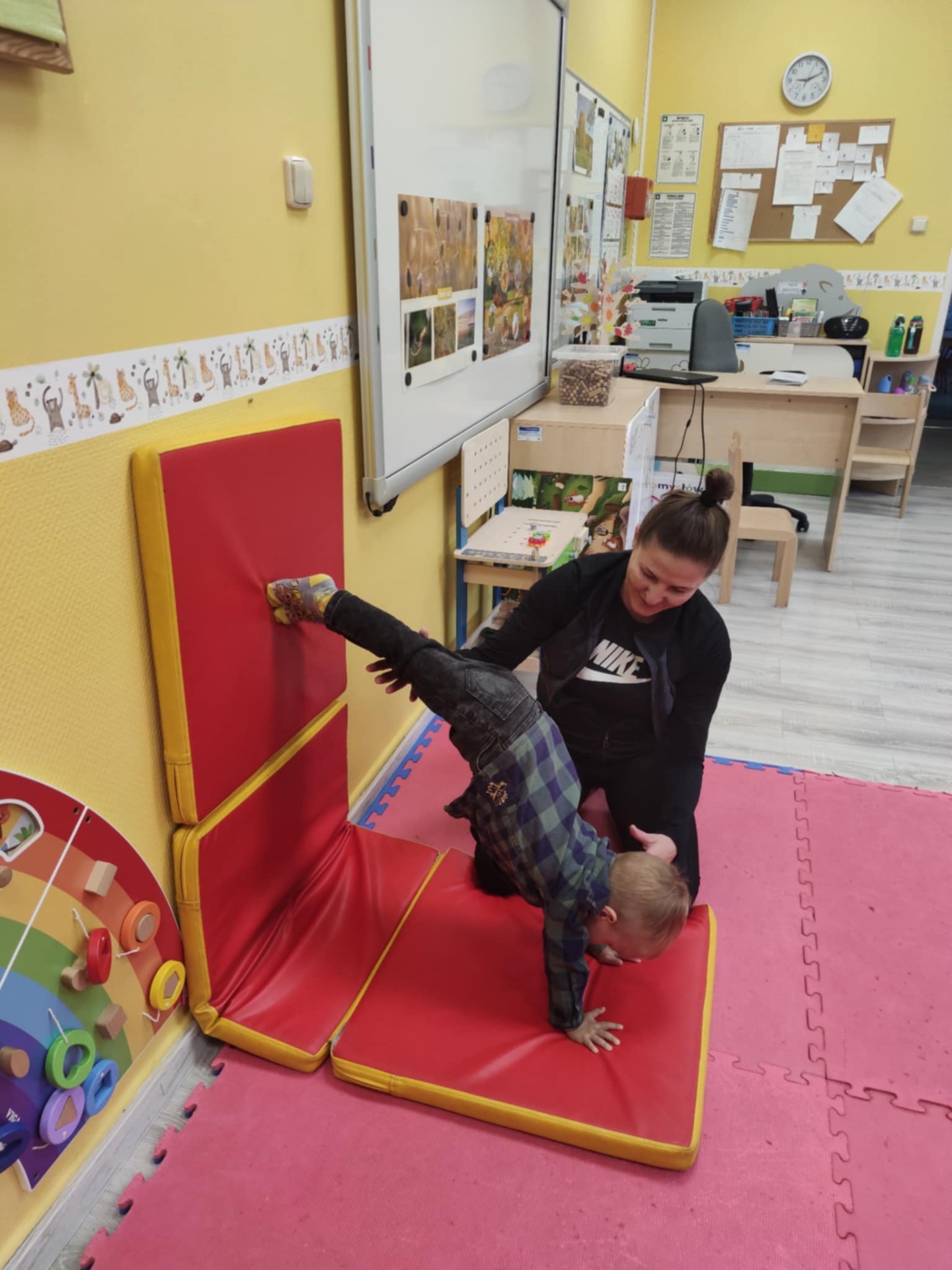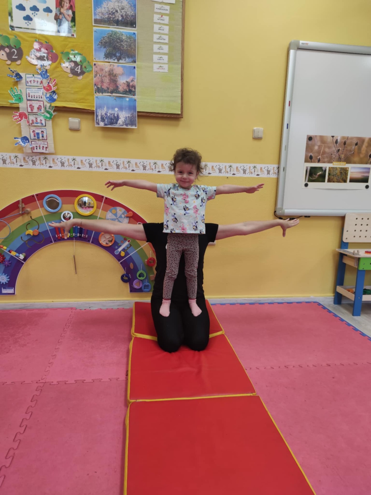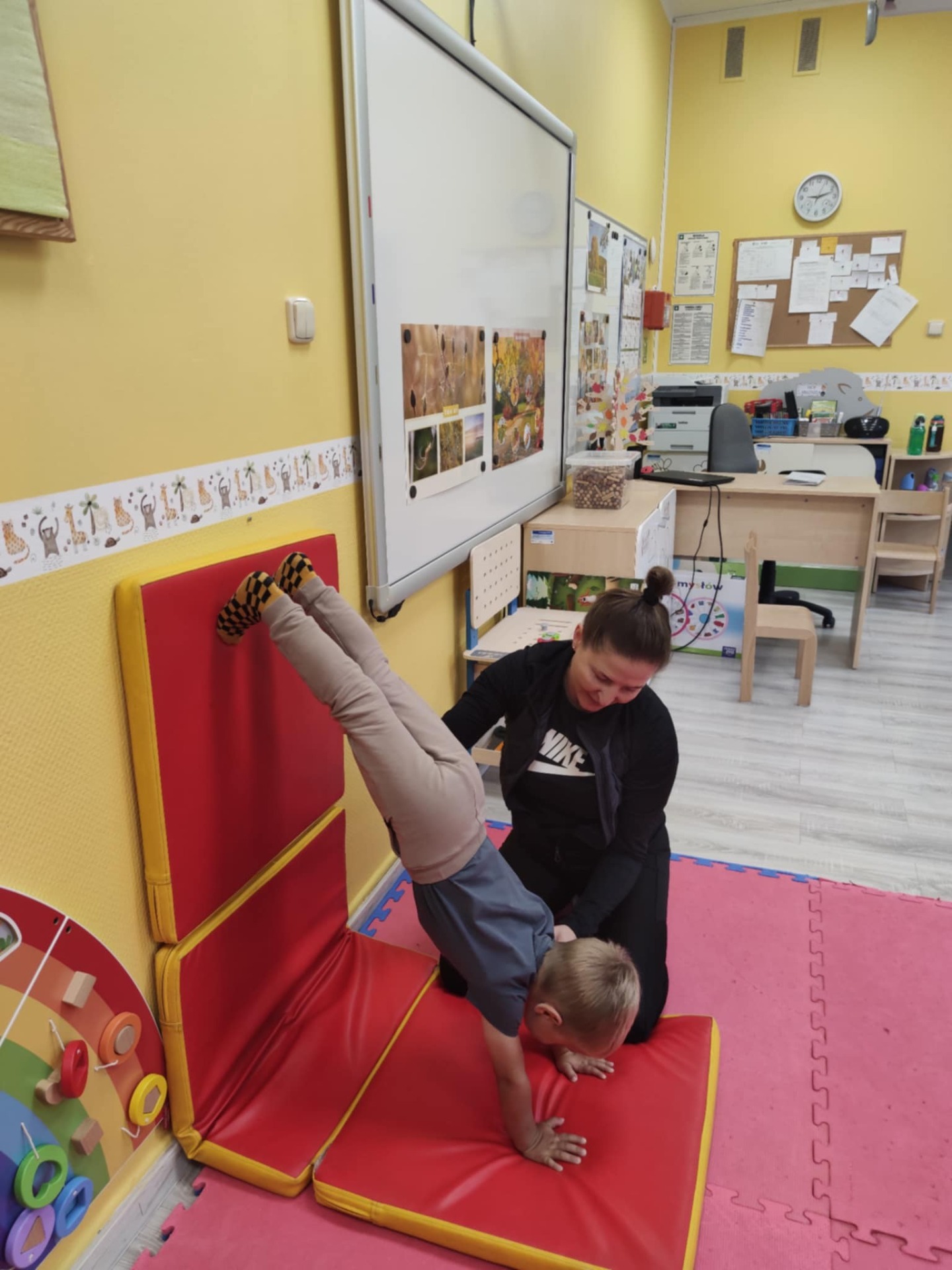 Dzieci z przedszkola zdobywają nowe umiejętności na zajęciach akrobatycznych.