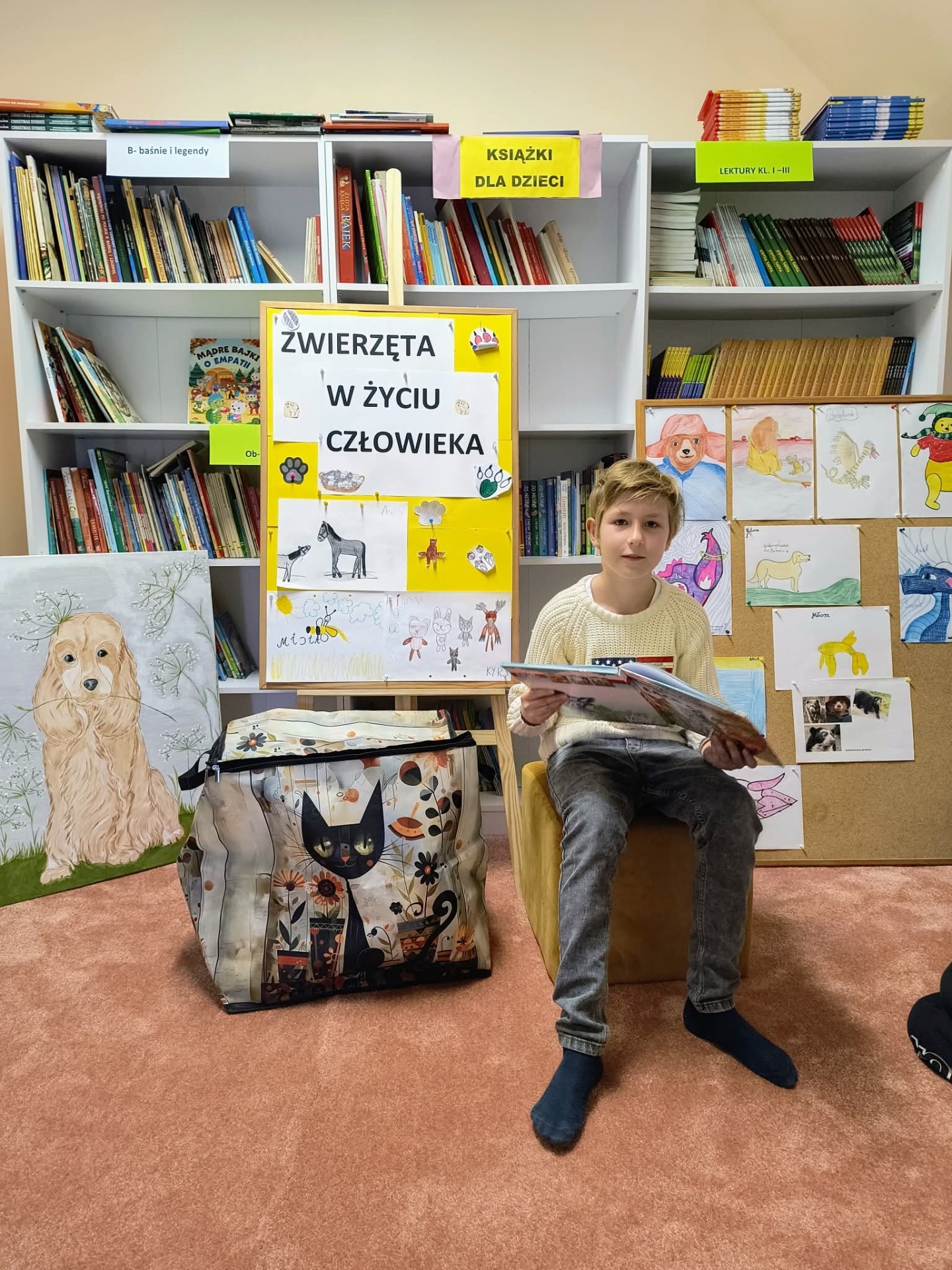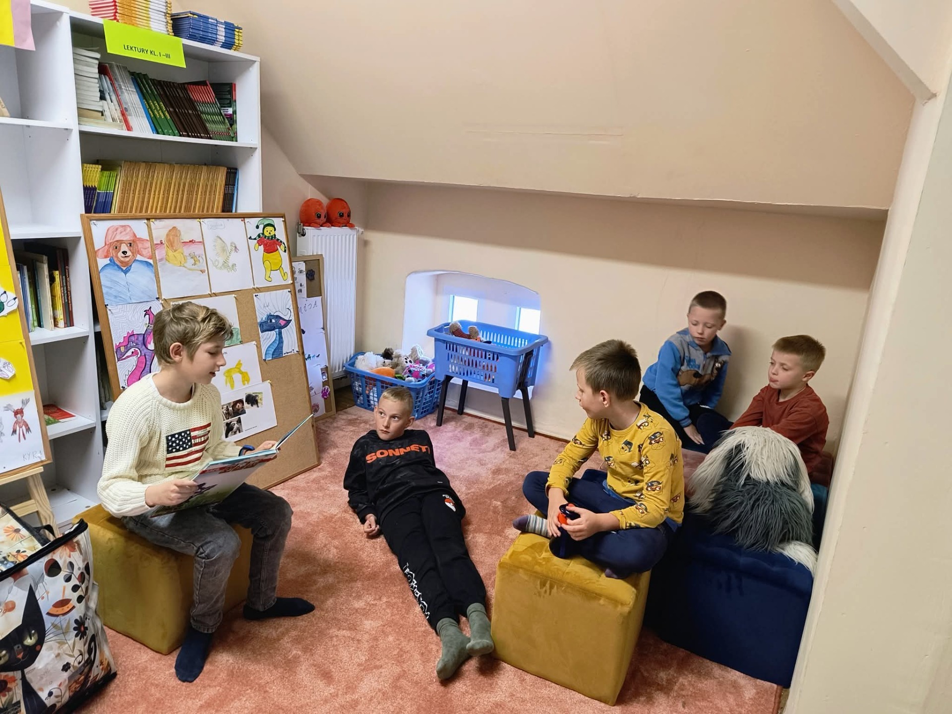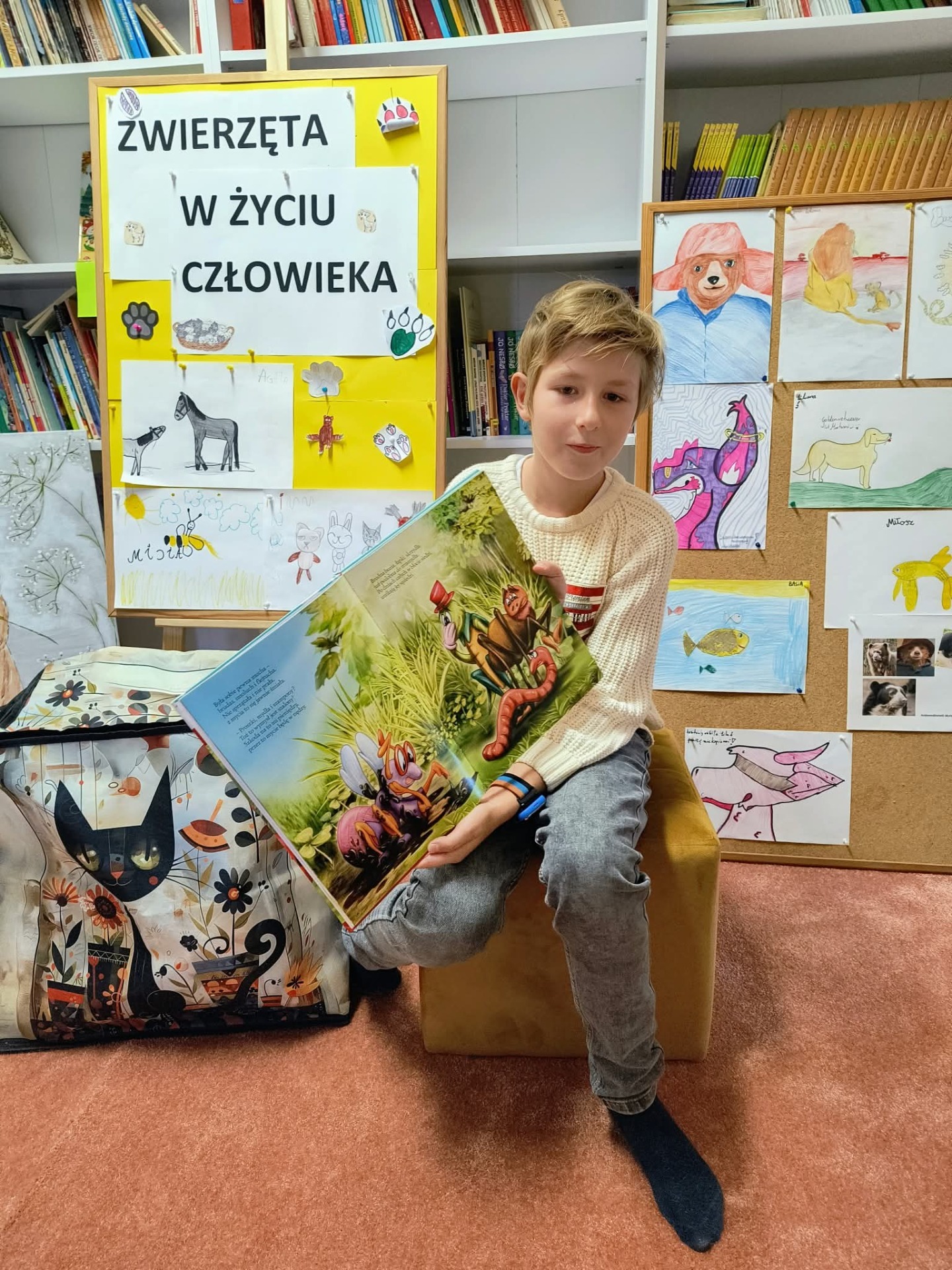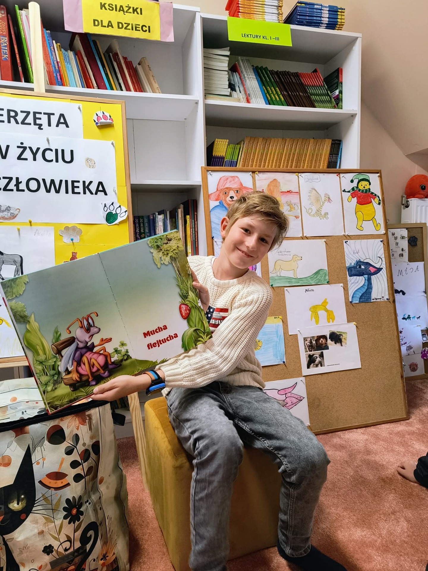 W czwartek, 16.10.2025 r. odbyło się kolejne spotkanie czytelnicze - "Czytanie na dywanie". Tym razem wyzwanie podjął Dominik, prezentując utwór poetycki wybrany ze zbioru, pt. "Między nami zwierzakami". Zaproszeni koledzy wysłuchali bajki, pt. "Mucha flejtucha". Spotkanie odbyło się w przyjaznej atmosferze, bo umiejętność słuchania jest również wyzwaniem.