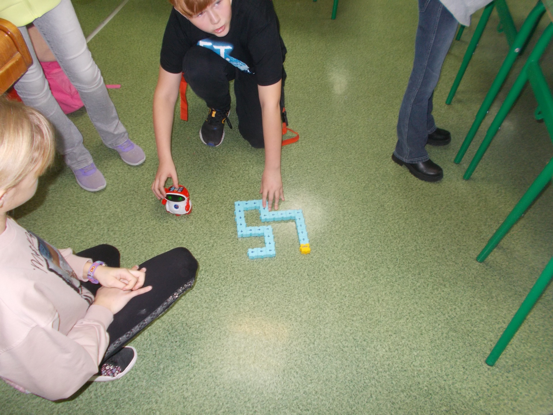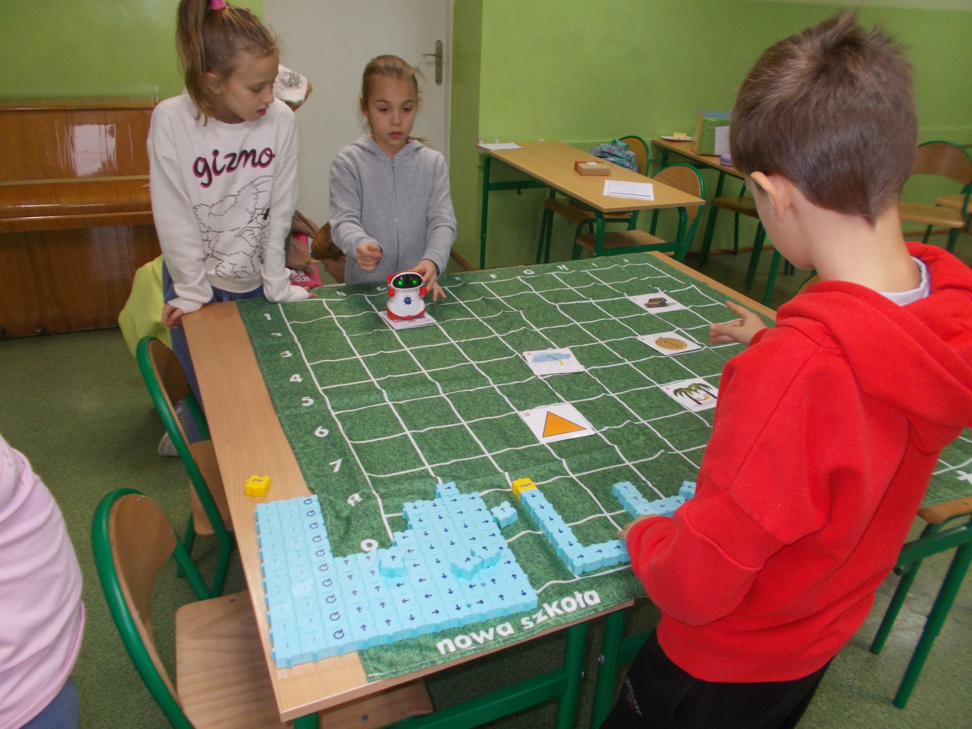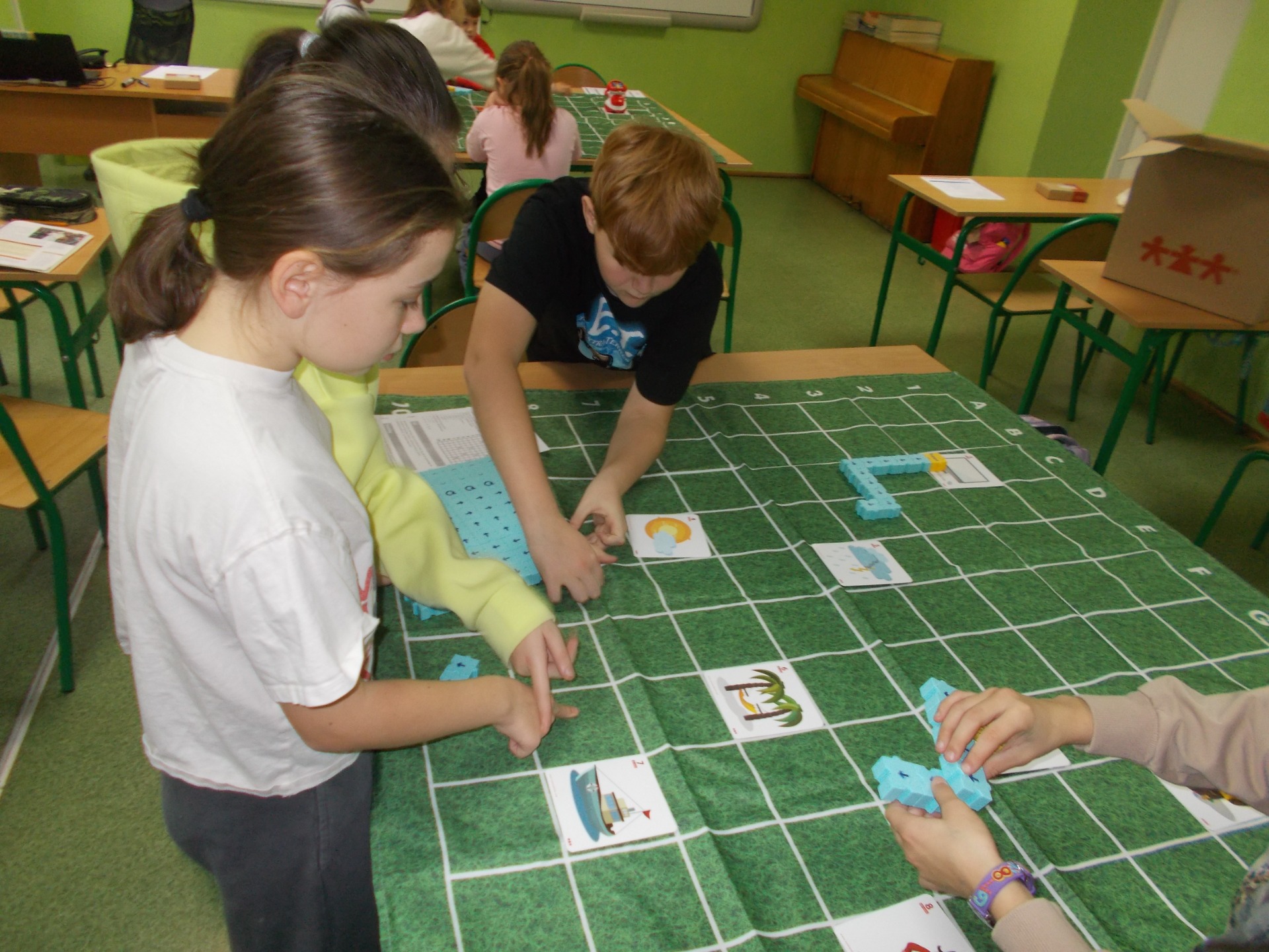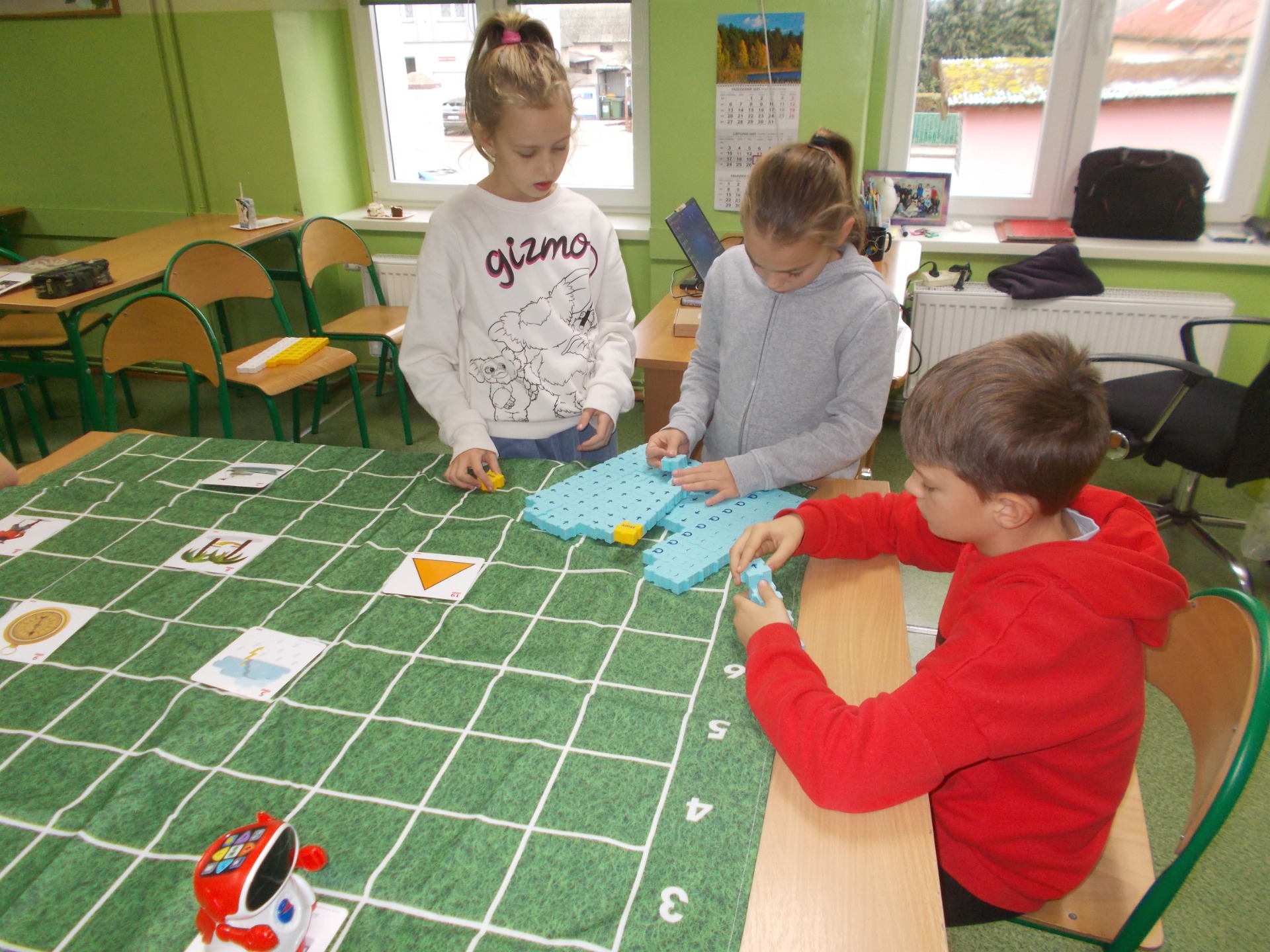 Dnia 20 listopada uczniowie kl. IV ćwiczyli umiejętność programowania w oparciu o mówiący robot edukacyjny. SuperDok - to sympatyczny robot, który mówi i intuicyjnie wprowadza w podstawy programowania. Zadanie polegało na ułożenie trasy dla naszego robota tak by dotarł do skrzyni ze skarbem. Liczyliśmy pola, po których ma się poruszać SuperDoc, aby dotarł do poszczególnych obiektów rozmieszczonych na planszy. Następnie dzieci układały algorytm trasy z klocków Morphun. Na tej podstawie zaprogramowały odpowiednią sekwencję ruchów, robot je zapamiętał i poruszał się po planszy do wybranego obiektu. Zajęcia były przyjemne i sprawiały dużo radości.