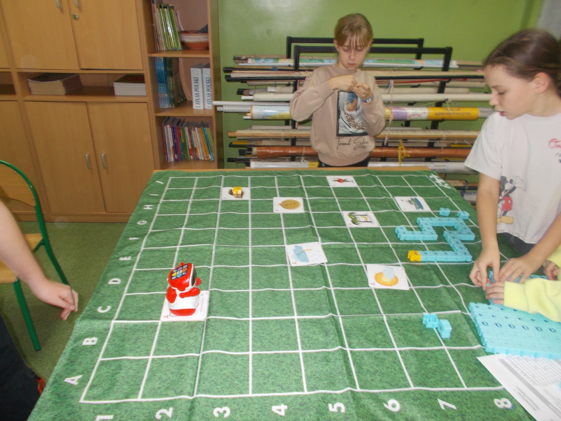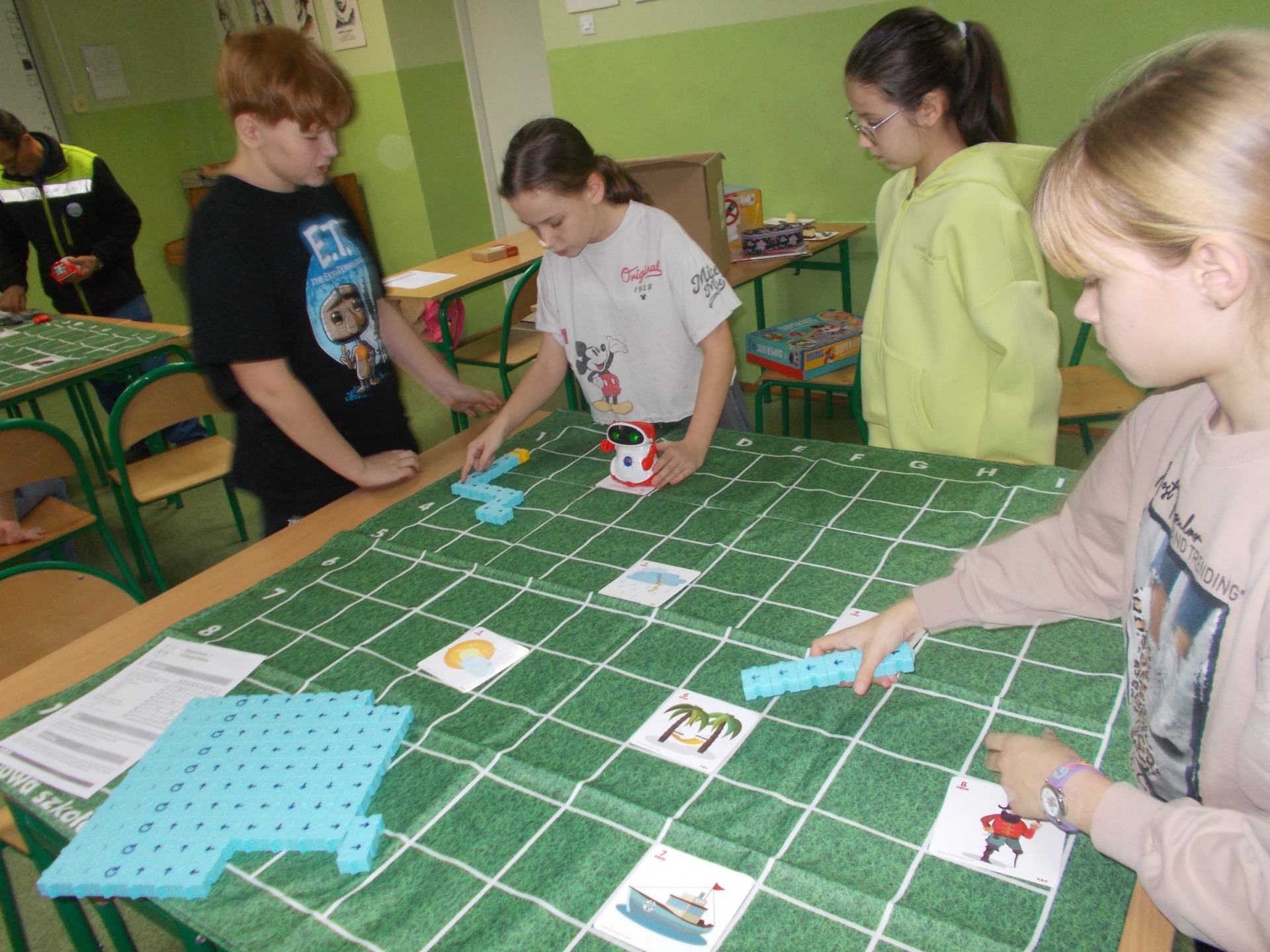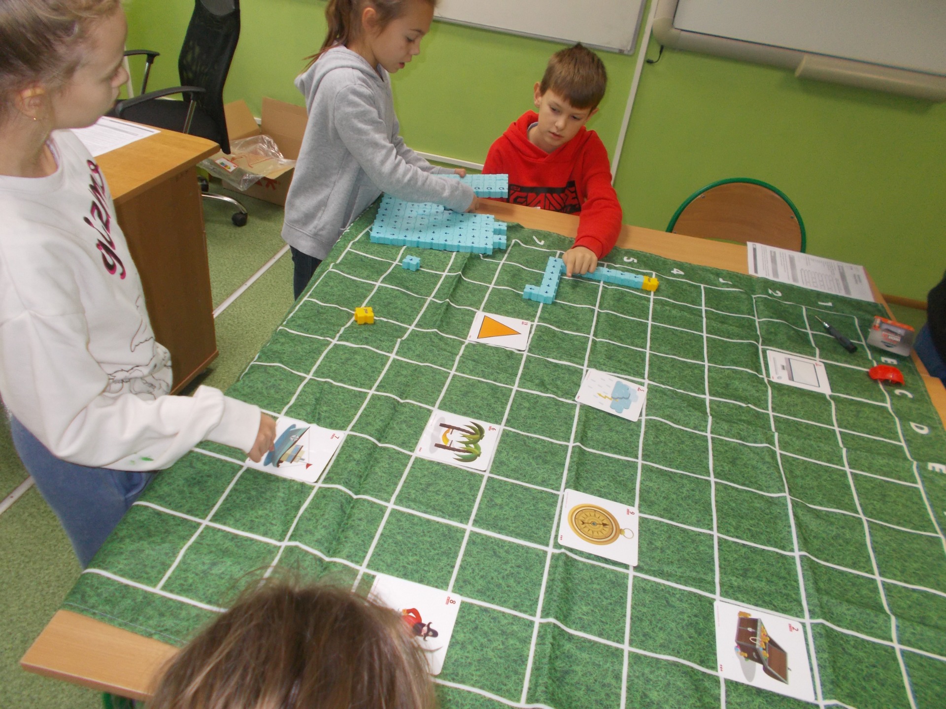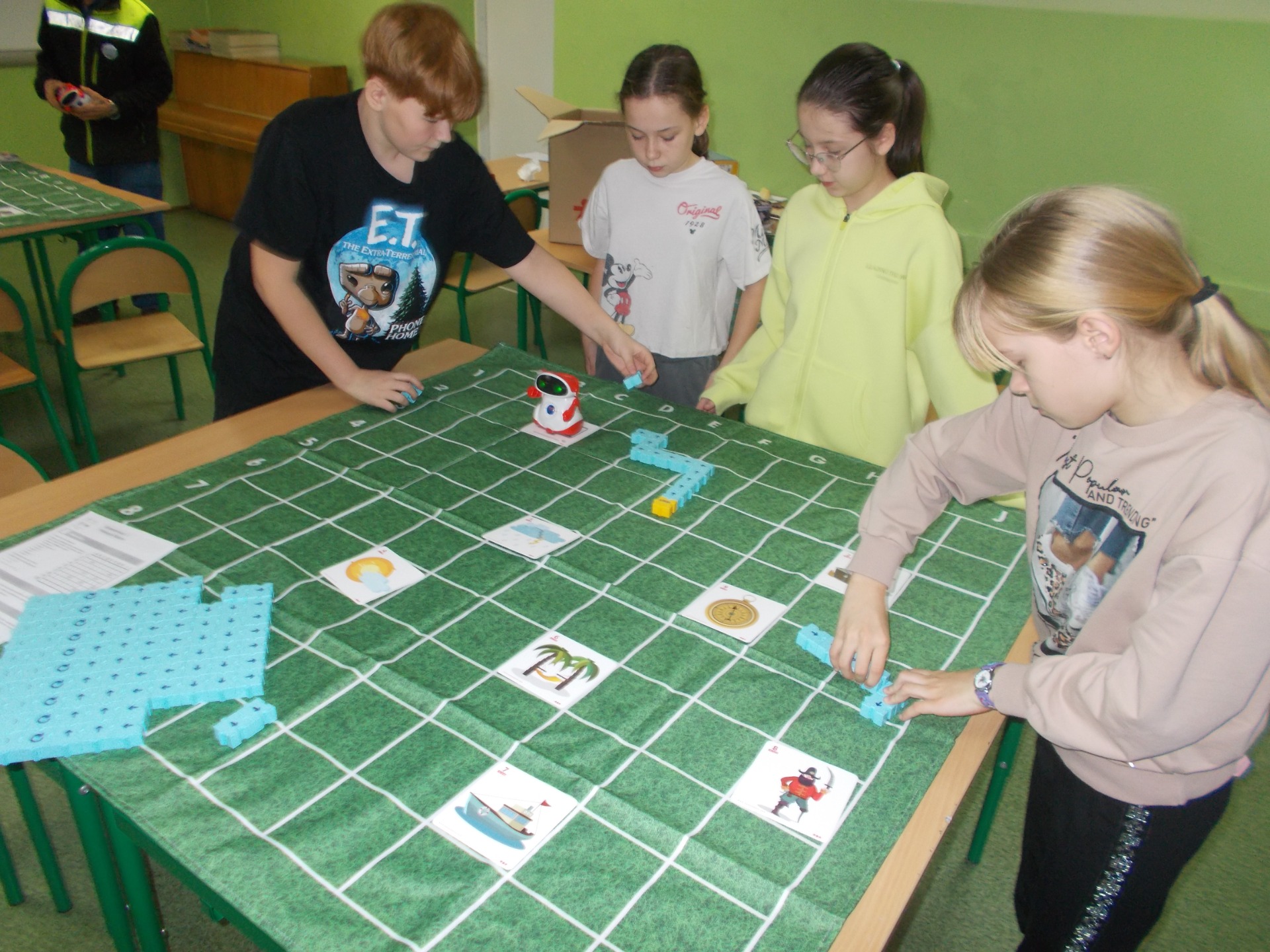 Dnia 20 listopada uczniowie kl. IV ćwiczyli umiejętność programowania w oparciu o mówiący robot edukacyjny. SuperDok - to sympatyczny robot, który mówi i intuicyjnie wprowadza w podstawy programowania. Zadanie polegało na ułożenie trasy dla naszego robota tak by dotarł do skrzyni ze skarbem. Liczyliśmy pola, po których ma się poruszać SuperDoc, aby dotarł do poszczególnych obiektów rozmieszczonych na planszy. Następnie dzieci układały algorytm trasy z klocków Morphun. Na tej podstawie zaprogramowały odpowiednią sekwencję ruchów, robot je zapamiętał i poruszał się po planszy do wybranego obiektu. Zajęcia były przyjemne i sprawiały dużo radości.